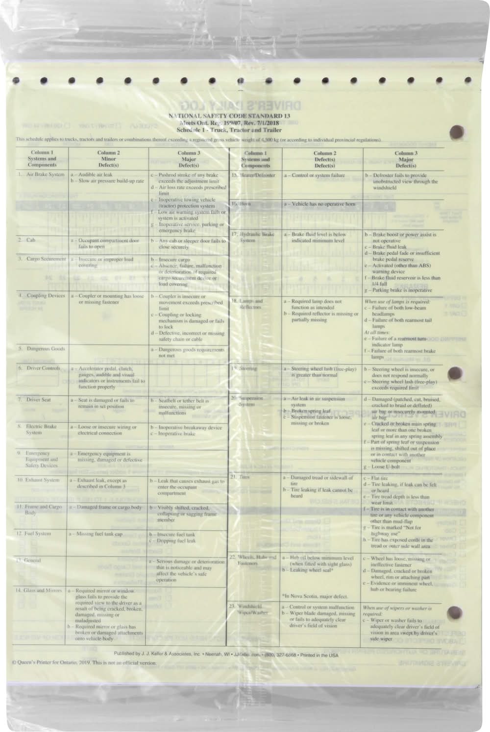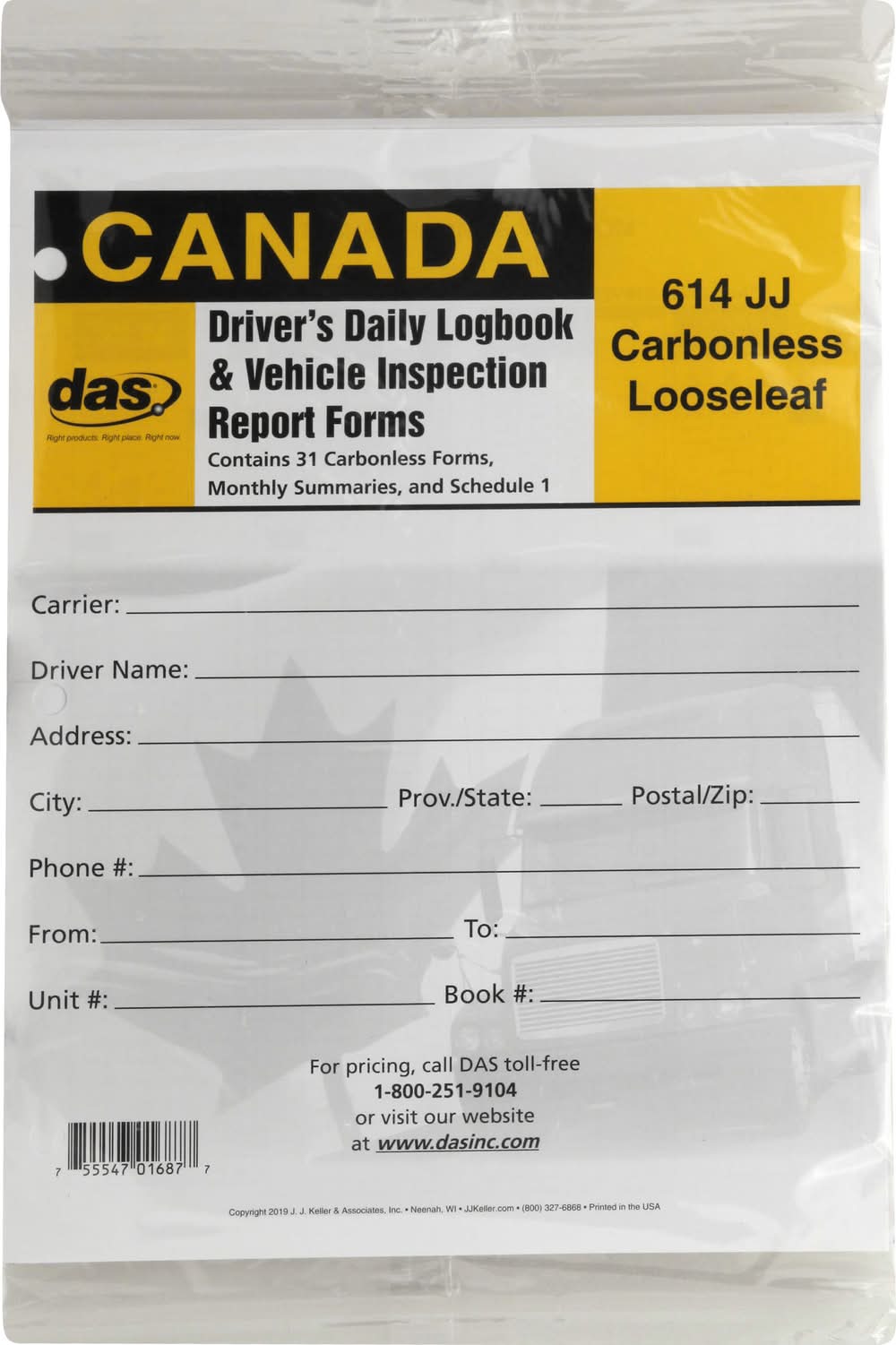 Contains 31 carbonless forms, monthly summaries, and schedule 1. Driver's daily logbook & vehicle inspection report forms. 612 JJ carbonless looseleaf. Right product. Right place. Right now. JJKeller.com. www.dasinc.com. For pricing, call DAS toll-free 1-800-251-9104 or visit our website at www.dasinc.com. Printed in the USA. Jj Keller,
