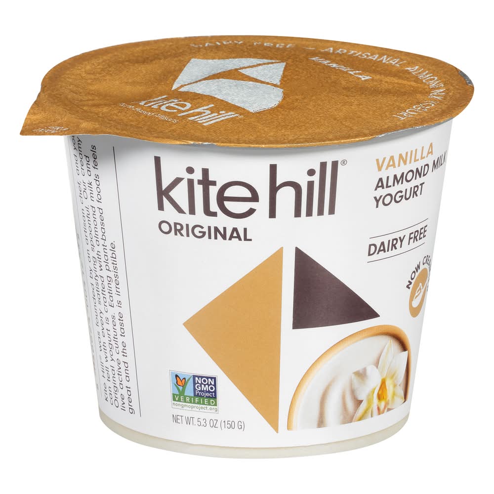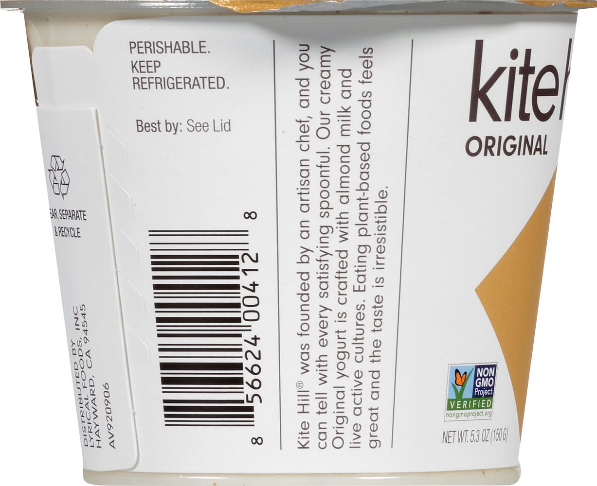 No artificial flavors or preservatives. Dairy free. Soy free. Gluten free. Vegan. Non GMO. Non GMO Project verified. nongmoproject.org. Now creamier. Dairy-free - artisanal almond milk yogurt. Plant-based artisans. Kite Hill was founded by an artisan chef, and you can tell in every satisfying spoonful. Our creamy original yogurt is crafted with almond milk and live cultures. The larger multi-serve container size is perfect for sharing and including in your favorite sweet recipes. Eating plant-based foods feels great and the taste is irresistible. Made from live cultures. kite-hill.com. (at)kitehillfoods. Tear, separate & recycle. • Lyrical Foods Inc., Hayward,CA,94545 • Packaging: Reusable