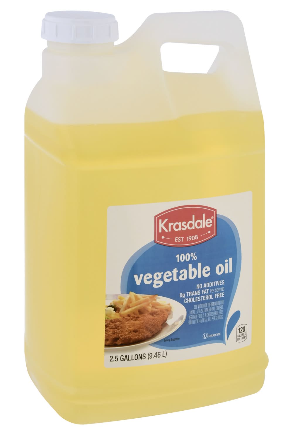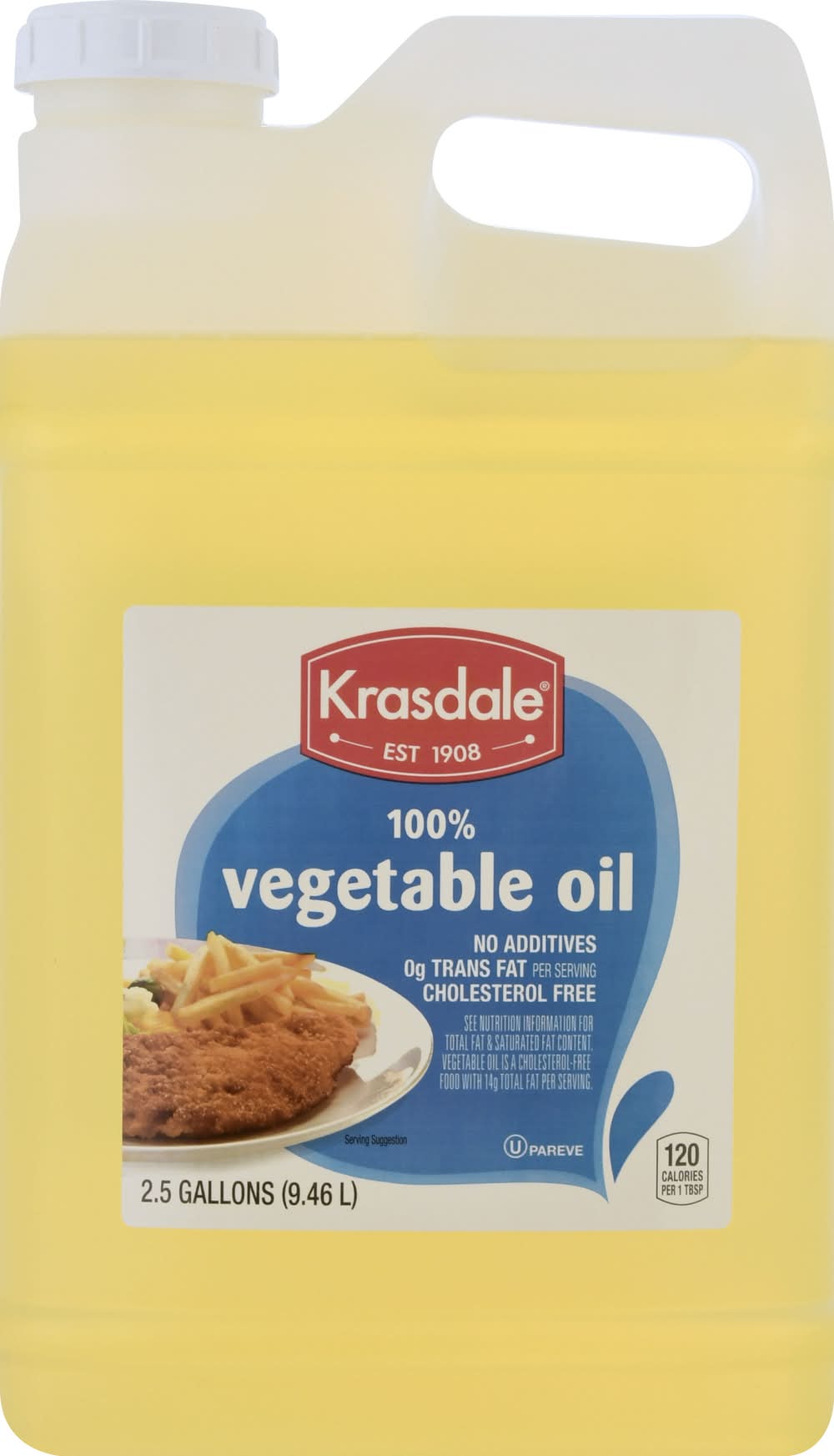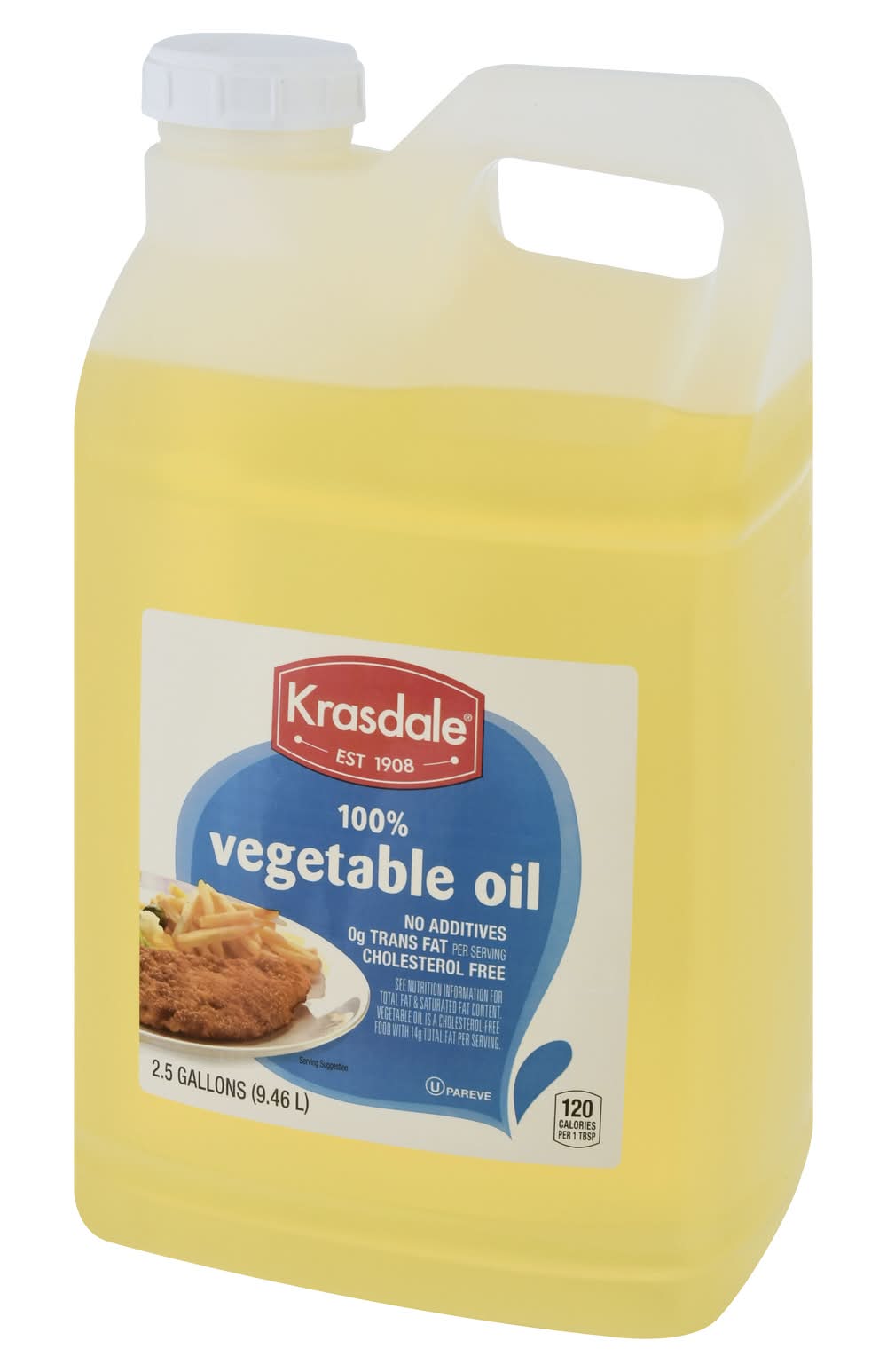 0 g trans fat per serving. 120 calories per 1 tbsp. No additives. Cholesterol free. See nutrition information for total fat & saturated fat content. Vegetable oil is a cholesterol-free food with 14 g total fat per serving. Est 1908. krasdalefoods.com. This product contains soybean oil from the countries indicated below: CA = Canada, US = USA. Krasdale Foods,