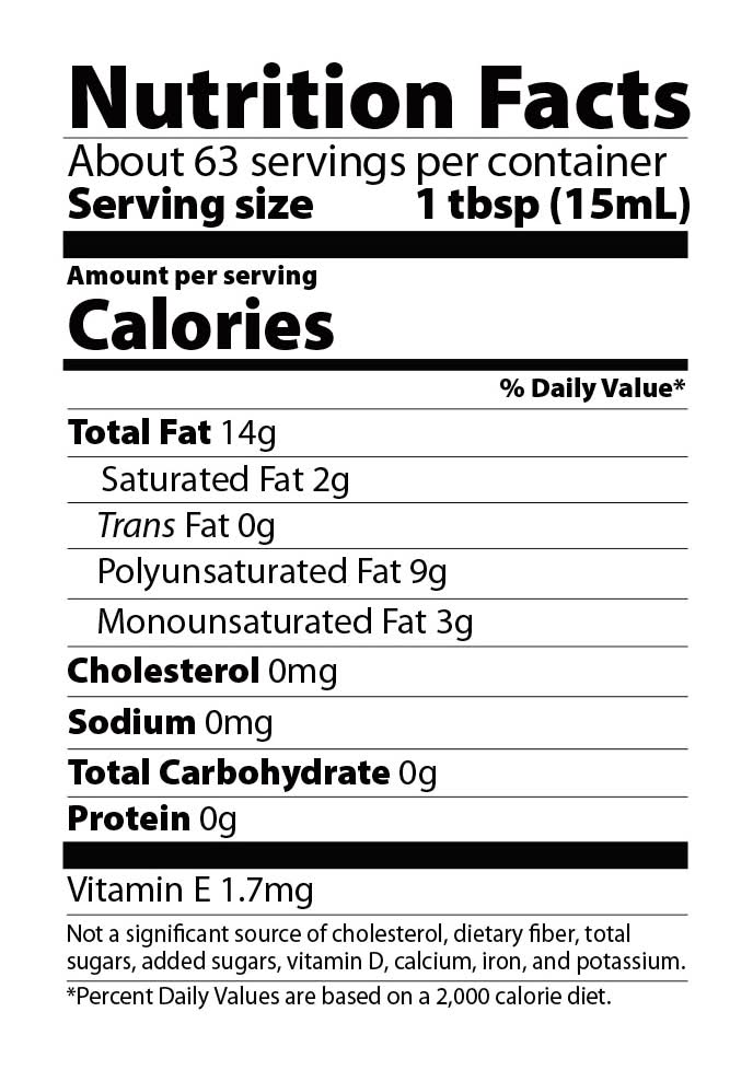 100% Pure Soybean Oil, Certified by the American Heart Association (AHA), Meats Criteria for Heart-Healthy Food, Cholesterol Free, Naturally contains Omegas 3, 6 and 9, Vitamin E Supportive but not conclusive scientific evidence suggest that eating about 1 1/2 tablespoons (20.5 grams) daily of soybean oil, which contains unsaturated fat, may reduce the risk of coronary heart disease. To achieve this possible benefit, soybean oil is to replace saturated fat and not increase the total number of calories you eat in a day. One serving of this product contains 14 grams (15 ml) of soybean oil.