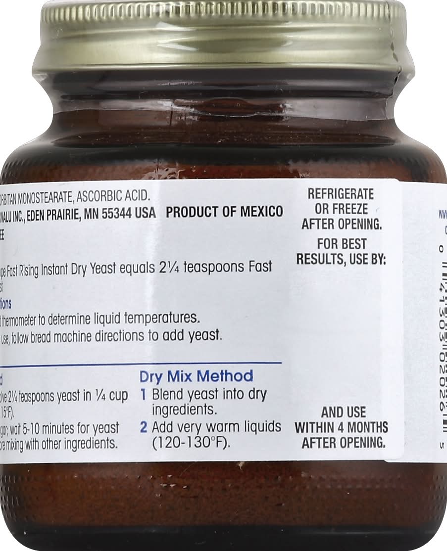 Directions: Refrigerate or freeze after opening. For best results, use by date on package and use within 4 month after opening. Conversions: 1 (0.25 ounce) envelope fast rising instant dry yeast equals 2-1/4 teaspoons fast rising instant dry yeast. Preparation: Use an instant read thermometer to determine liquid temperatures. For bread machine use, follow bread machine directions to add yeast. To Activate Yeast: Traditional Method: 1. In small bowl, dissolve 2-1/4 teaspoons yeast in 1/4 cup warm liquid (110-115 degrees F). 2. Add 1/2 teaspoon sugar; wait 5-10 minutes for yeast to foam (proof) before mixing with other ingredients. Dry Mix Method: 1. Blend yeast into dry ingredients. 2. Add vary warm liquids (120-130 degrees F).
