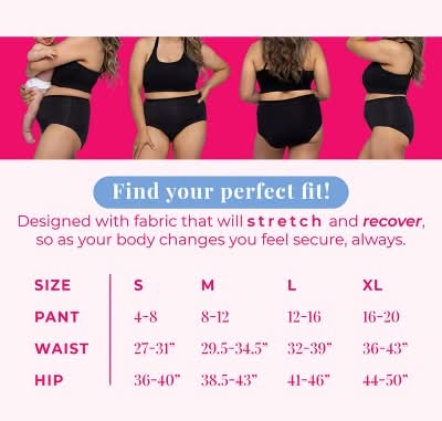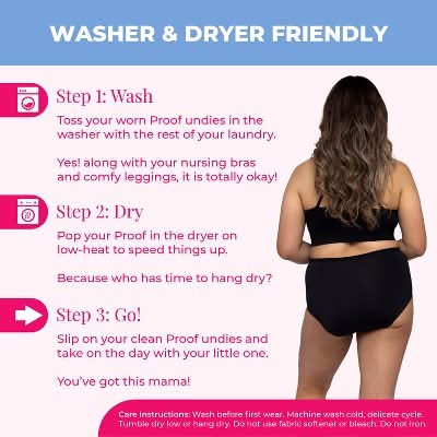 Real fabric, full coverage, high rise brief with built-in protection that will absorb moderate postpartum flows and discharge for up to 12 hours. Designed with fabric that will stretch and recover, so as your body changes you always feel secure. Proof Postpartum Undies are washer & dryer friendly so you can ease your load and wear them again and again. Slip on your Proof Undies and take on the day with your little one - you got this mama!