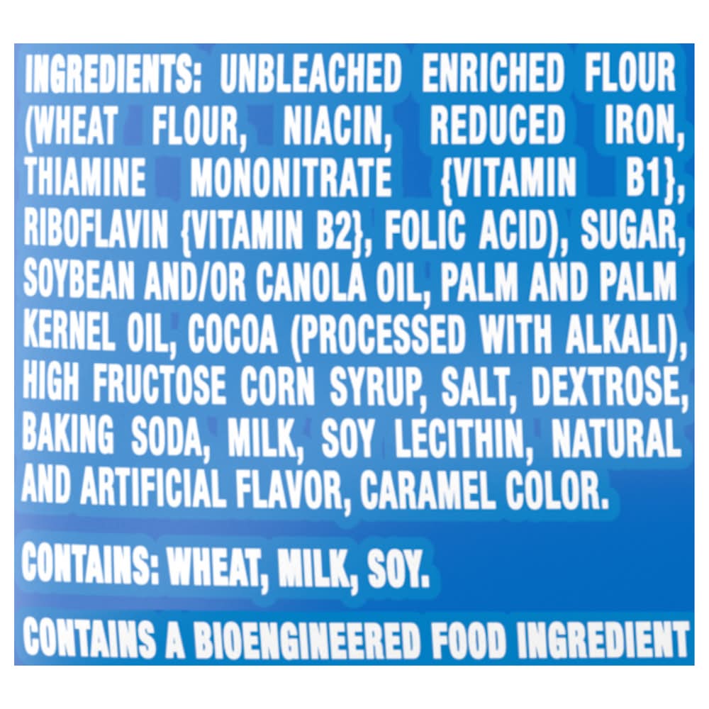 Ingredients: INGREDIENTS: UNBLEACHED ENRICHED FLOUR (WHEAT FLOUR, NIACIN, REDUCED IRON, THIAMINE MONONITRATE {VITAMIN B1}, RIBOFLAVIN {VITAMIN B2}, FOLIC ACID), SUGAR, CANOLA OIL, PALM AND PALM KERNEL OIL, COCOA (PROCESSED WITH ALKALI), HIGH FRUCTOSE CORN SYRUP, SALT, DEXTROSE, BAKING SODA, MILK, SOY LECITHIN, NATURAL AND ARTIFICIAL FLAVOR, CARAMEL COLOR.CONTAINS: WHEAT, MILK, SOY. Contains: CONTAINS: WHEAT, MILK, SOY.