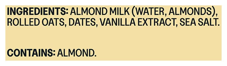 Ingredients: Almond Milk (Water Almonds), Rolled Oats, Dates, Vanilla Extract, Sea Salt Contains: Oat, Peanuts