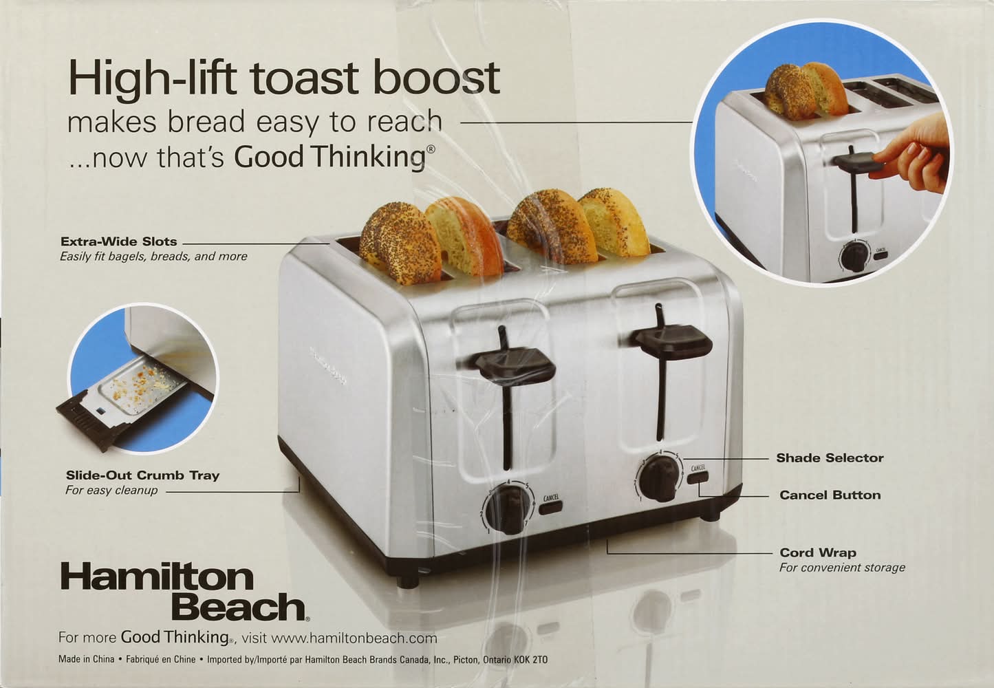 4 extra-wide slots. Easy cleanup with slide-out crumb trays. High-lift toast boost makes it easier to reach small slices. Extra-wide slots. Adjustable browning control for perfect toast, batch after batch. Cancel/auto shutoff. Good thinking. High-lift toast boost makes bread easy to reach - now that's good thinking. Extra-Wide Slots: Easily fit bagels, breads, and more. Slide-Out Crumb Tray: For easy cleanup. Shade selector. Cancel button. Cord wrap: for convenient storage. Type T111. 120 V. 60 Hz. 1500 W. For more good thinking, visit www.hamiltonbeach.com. Questions? USA 1-800-851-8900. C/ETL/US listed. Intertek. Made in China. Glen Allen, VA 23060