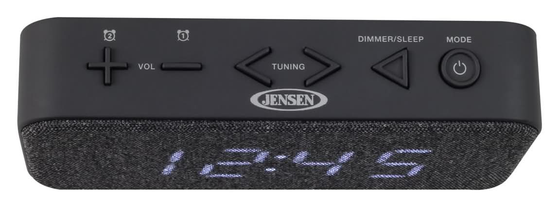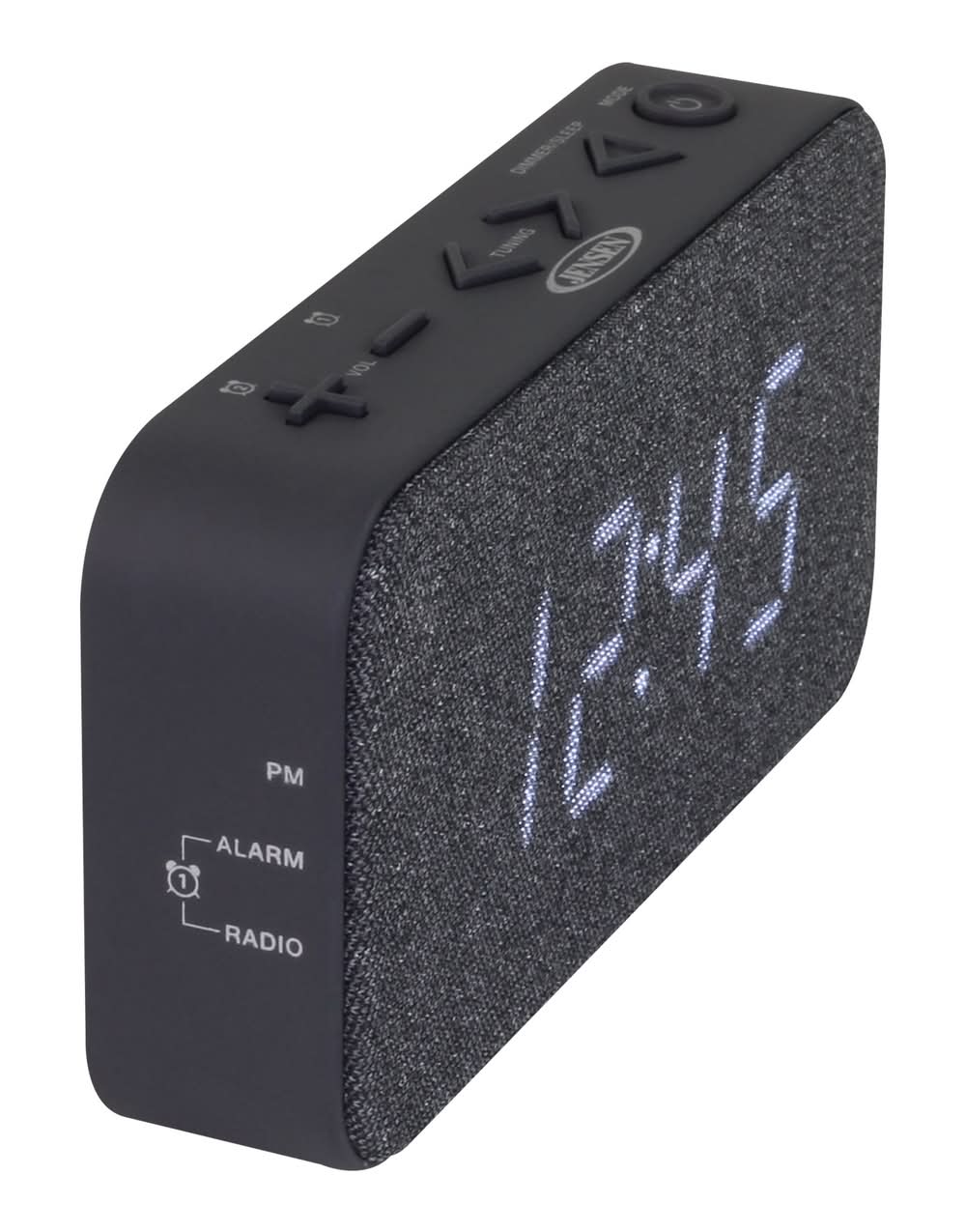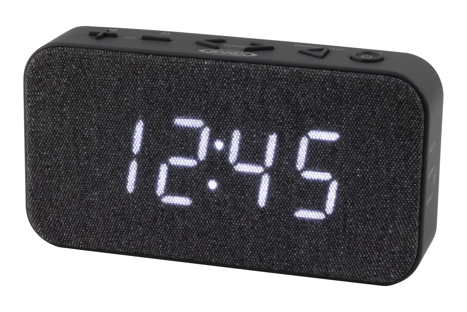 The JENSEN JCR-229 digital dual alarm clock radio offers a stylish design and fabric front panel that's perfect for any décor. Use it on a nightstand or around your home or office. Two separate alarms let you wake to the alarm or radio, and the digital FM receiver includes 10 presets for easy access. The 1.2" white digital LED display is easy to see from across the room and compliments the overall design. Other features include a hi/low dimmer switch, sleep function and 1 Amp USB port for charging your smartphone. The unit operates on 120V AC power, and has a battery back-up feature for saving your time settings in case of a power outage. Spectra Merchandising International,
