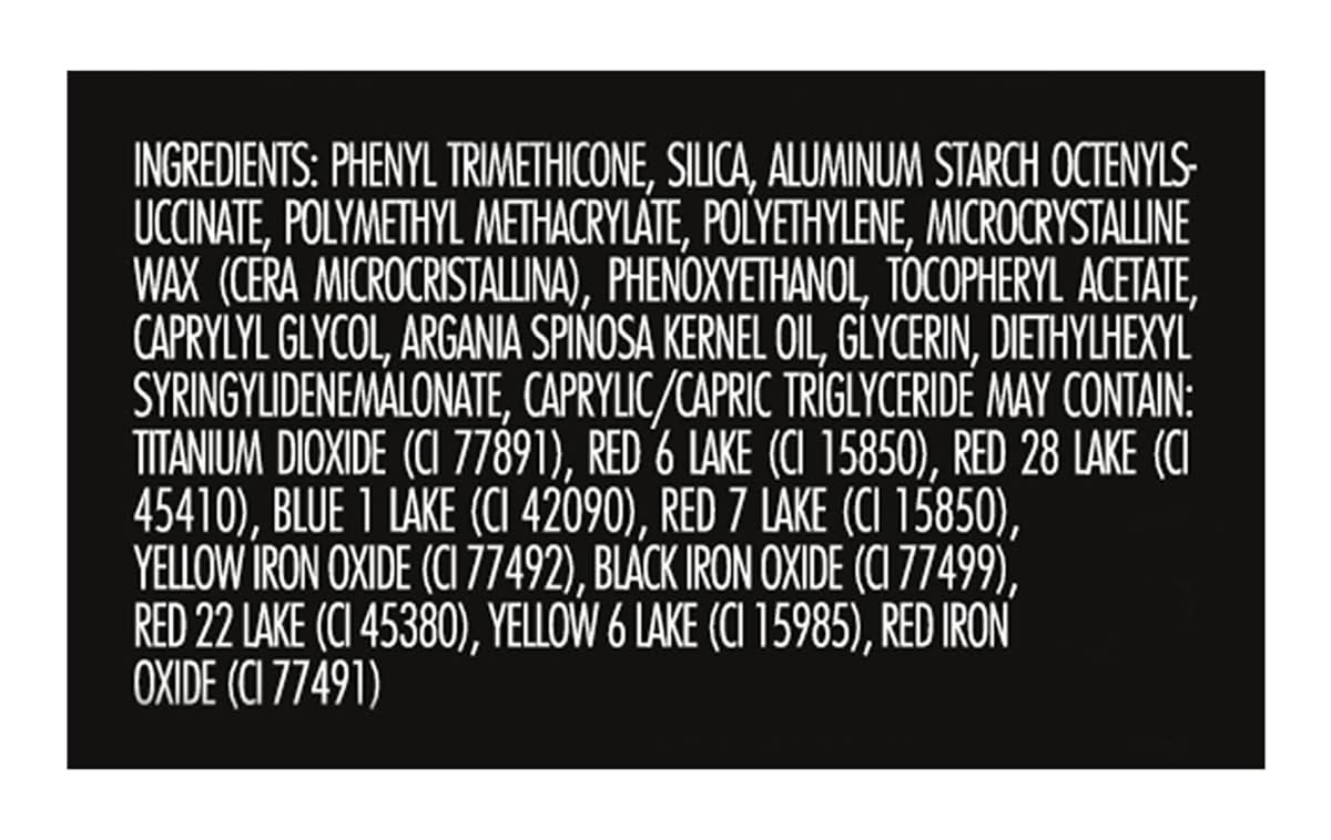 Ingredients: Phenyl Trimethicone, Silica, Aluminum Starch Octenylsuccinate, Polymethyl Methacrylate, Polyethylene, Microcrystalline Wax (Cera Microcristallina), Phenoxyethanol, Tocopheryl Acetate, Caprylyl Glycol, Argania Spinosa Kernel Oil, Glycerin, Diethylhexyl Syringylidenemalonate, Caprylic/Capric Triglyceride May Contain: Titanium Dioxide (CI 77891), Red 6 Lake (CI 15850), Red 28 Lake (CI 45410), Blue 1 Lake (CI 42090), Red 7 Lake (CI 15850), Yellow Iron Oxide (CI 77492), Black Iron Oxide (CI 77499) Red 22 Lake (CI 45380), Yellow 6 Lake (CI 15985), Red Iron Oxide (CI 77491) Contains: Tree Nuts