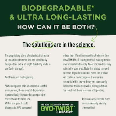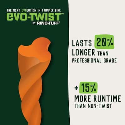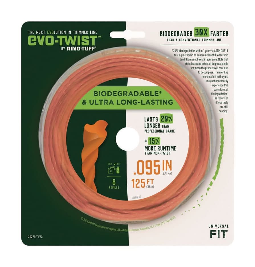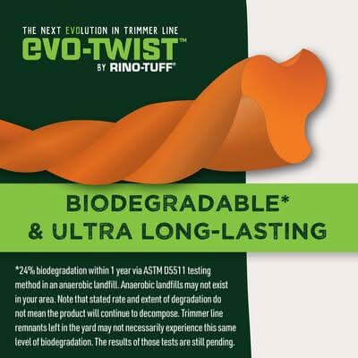 EVO-Twist by Rino-Tuff is a professional grade trimmer line that is 20% more durable than our current professional grade line AND biodegrades 30x faster than a conventional trimmer line*. The aerodynamic twisted shape reduces line resistance and vibration, keeping the trimmer from slowing down, using less battery energy and cutting more, yielding up to 15% longer runtime for cordless trimmers. Impact modifiers are embedded within the nylon to keep your line from breaking away when trimming against obstacles as often as other products on the market. That means cutting more with fewer stops to get the job done faster.*24% biodegradation within 1 year via ASTM D5511 testing method in an anaerobic landfill. Anaerobic landfills may not be available in your area. Note that the stated rate and extent of degradation do not mean the product will continue to decompose. Trimmer line remnants left in the yard may not necessarily experience this same level of biodegradation. The results of those tests are still pending. • Color: Orange • Size: 0.095 in X 125 ft