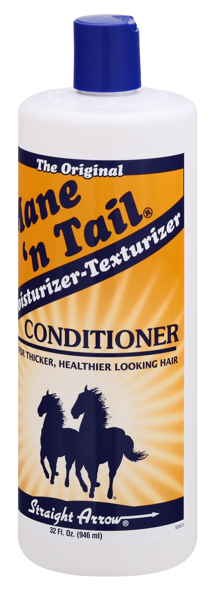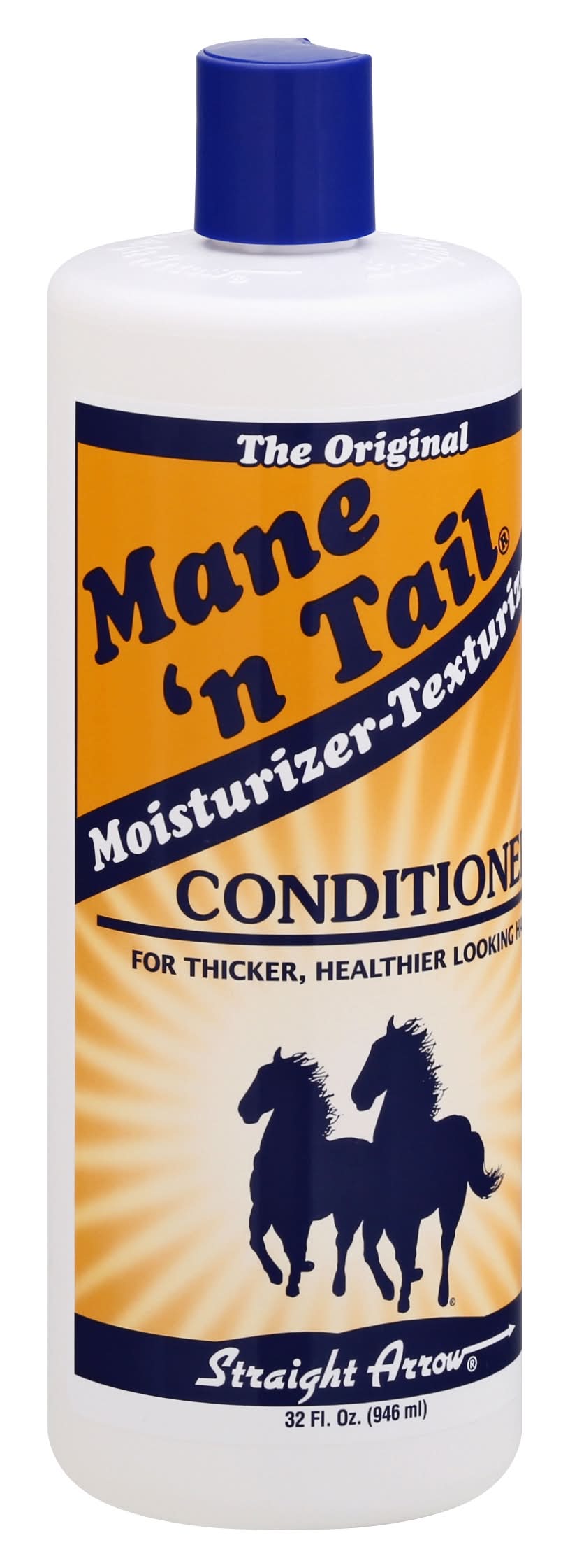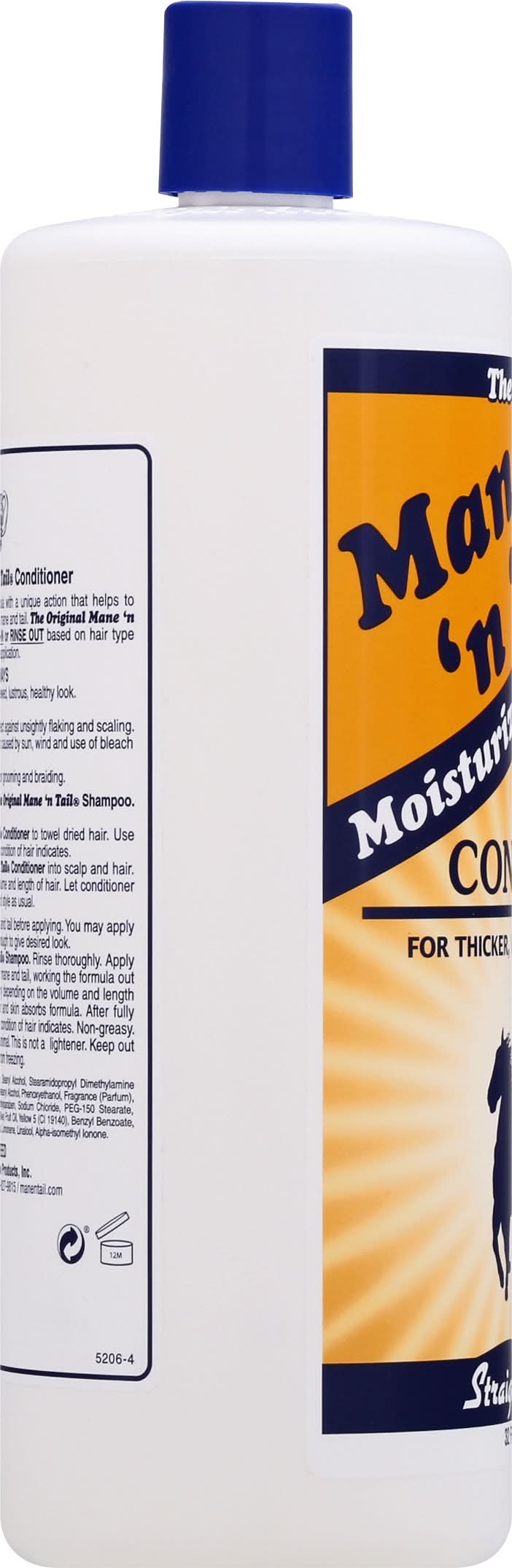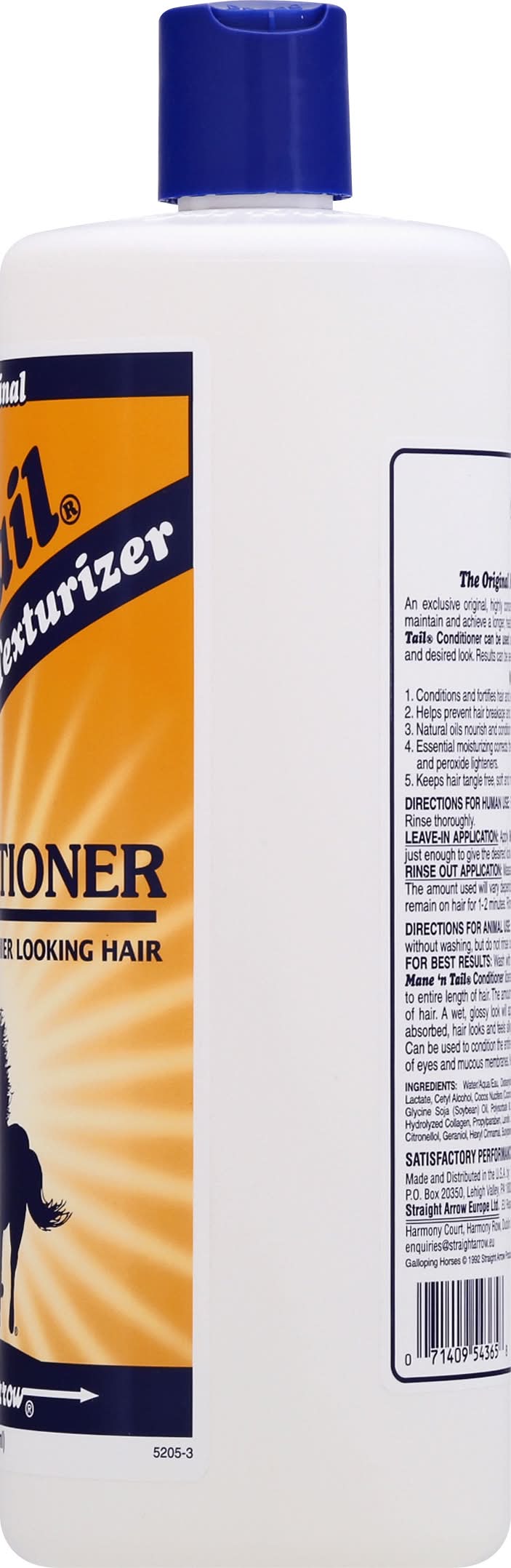 For thicker, healthier looking hair. An exclusive original, highly concentrated formula with a unique action that helps to maintain and achieve a longer, healthier-looking mane and tail. The Original Mane 'n Tail Conditioner can be used as a Leave-In or Rinse-Oust based on hair type and desired look. Results can be seen after one application. Works 5 Ways: 1. Conditions and fortifies hair and skin for a renewed, lustrous, healthy look. 2. Helps prevent hair breakage and split ends. 3. Natural oils nourish and condition scalp to protect against unsightly flaking and scaling. 4. Essential moisturizing corrects the drying effect caused by sun, wind and use of bleach and peroxide lighteners. 5. Keep hair tangle free, soft and manageable for grooming and braiding. Satisfactory Performance Guaranteed. manentail.com. Made in the U.S.A. Straight Arrow Products, Inc., PO Box 20350, Lehigh Valley, PA, 18002-0350