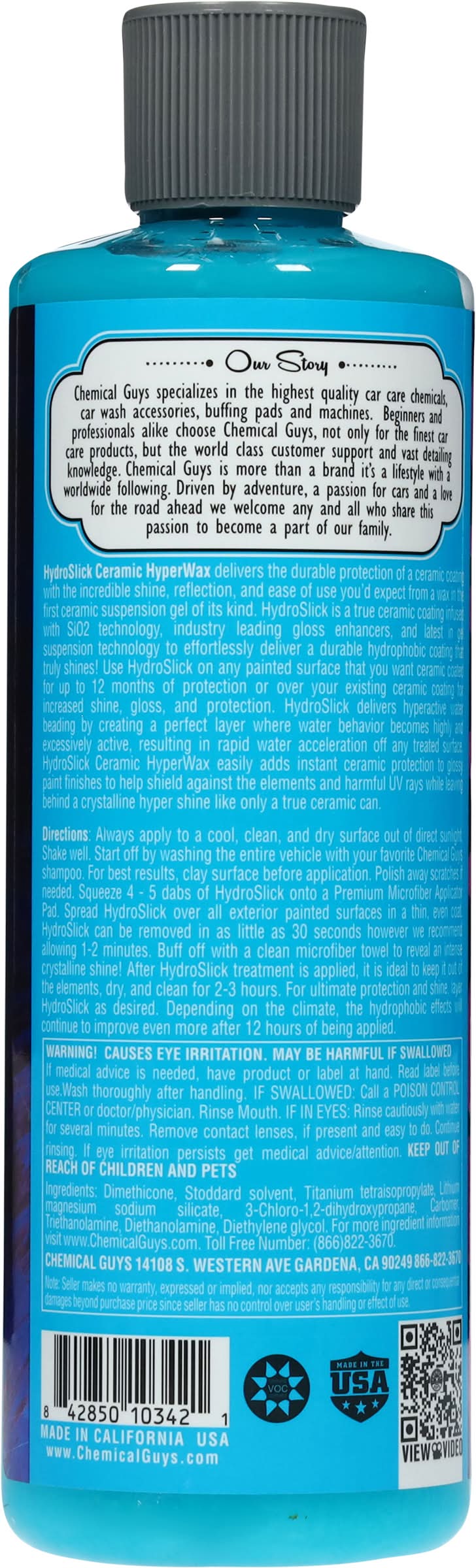 Usage of instructions:Directions: Always apply to a cool, clean, and dry surface out of direct sunlight. Shake well. Start off by washing the entire vehicle with your favorite Chemical Guys shampoo. For best results, clay surface before application, Polish away scratches if needed. Squeeze 4 - 5 dabs of HydroSlick onto a Premium Microfiber Applicator Pad. Spread HydroSlick over all exterior painted surfaces in a thin, even coat. HydroSlick can be removed in as little as 30 seconds however we recommend allowing 1-2 minutes. Buff off with a clean microfiber towel to reveal an intense crystalline shine! After HydroSlick treatment is applied, it is ideal to keep it out of the elements, dry, and clean for 2 – 3 hours. For ultimate protection and shine, layer HydroSlick as desired. Depending on the climate, the hydrophobic effects will continue to improve even more after 12 hours of being applied. - Directions: Always apply to a cool, clean, and dry surface out of direct sunlight. Shake well. Start off by washing the entire vehicle with your favorite Chemical Guys shampoo. For best results, clay surface before application, Polish away scratches if needed. Squeeze 4 - 5 dabs of HydroSlick onto a Premium Microfiber Applicator Pad. Spread HydroSlick over all exterior painted surfaces in a thin, even coat. HydroSlick can be removed in as little as 30 seconds however we recommend allowing 1-2 minutes. Buff off with a clean microfiber towel to reveal an intense crystalline shine! After HydroSlick treatment is applied, it is ideal to keep it out of the elements, dry, and clean for 2 – 3 hours. For ultimate protection and shine, layer HydroSlick as desired. Depending on the climate, the hydrophobic effects will continue to improve even more after 12 hours of being applied.