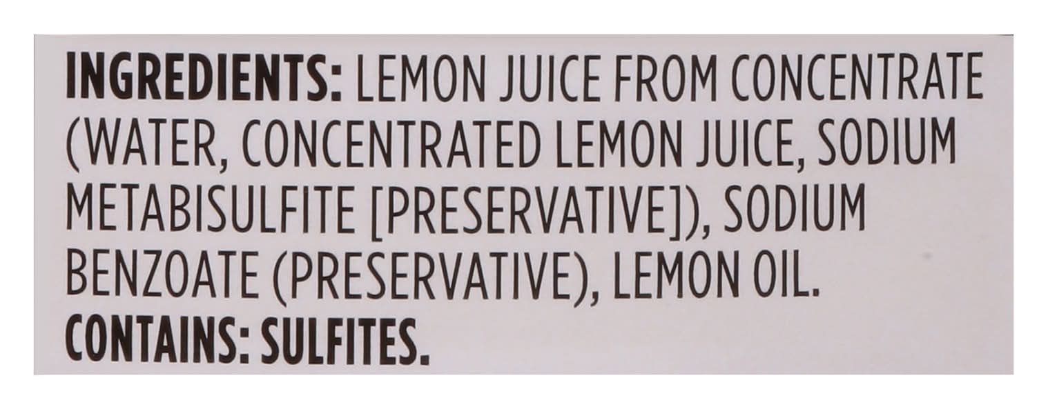 Lemon Juice from Concentrate (Water, Concentrated Lemon Juice, Sodium Metabisulfite [Preservative]), Sodium Benzoate (Preservative), Lemon Oil Contains: Sulfites