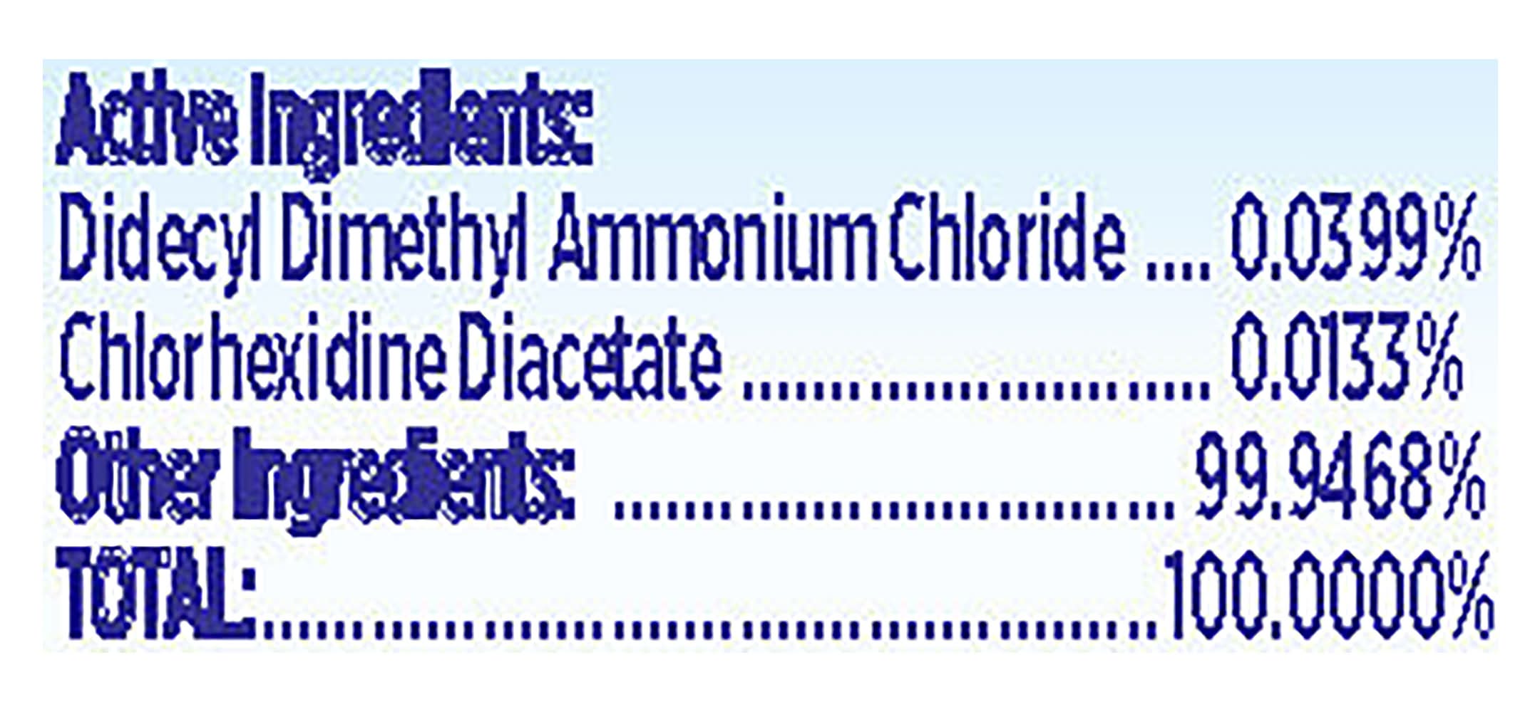 Ingredients: Active Ingredients: Didecyl Dimethyl Ammonium Chloride 0.0399% Chlorhexidine Diacetate 0.0133% Other Ingredients 99.9468% Total: 100.0000%