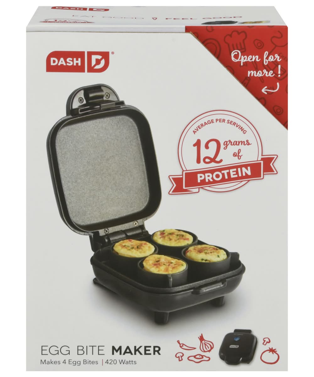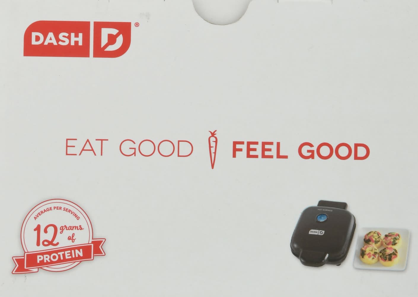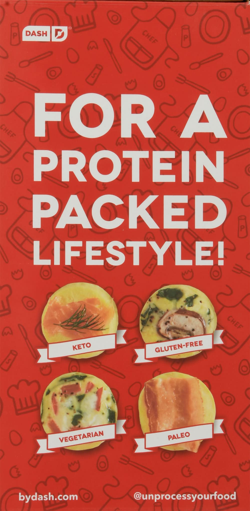 Average per serving 12 grams of protein. Keto. Gluten free. Paleo. Makes 4 egg bites. 420 watts. For a protein packed lifestyle! Keto. Gluten free. Vegetarian. Paleo. Eggs to go: The egg bite maker's design is compact and egg bites are easy to pack or freeze for later. Beyond eggs: Create sweet dessert bites, savory breakfast creations, and more! Easy to clean: 4 silicone cups release egg bites cleanly every time, so there's no mess. Recipe guide inside: Pick add-ins for delicious, protein-packed egg bites in your favorite flavors. Eat Good. Feel good. UL listed. bydash.com. storebound.com. (at)unprocessyourfood. Support hotline 1-800-898-6970 visit bydash.com. Made in China. Storebound LLC,