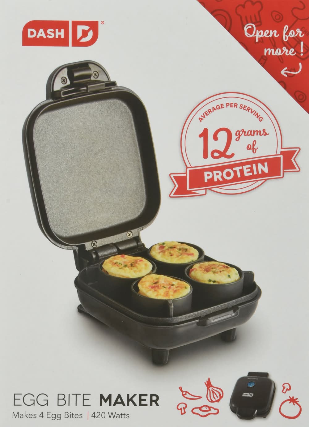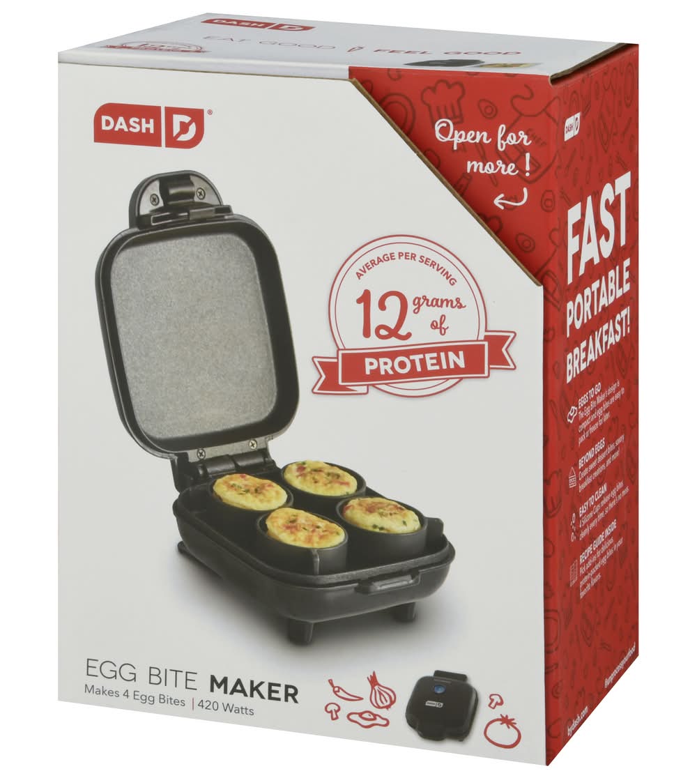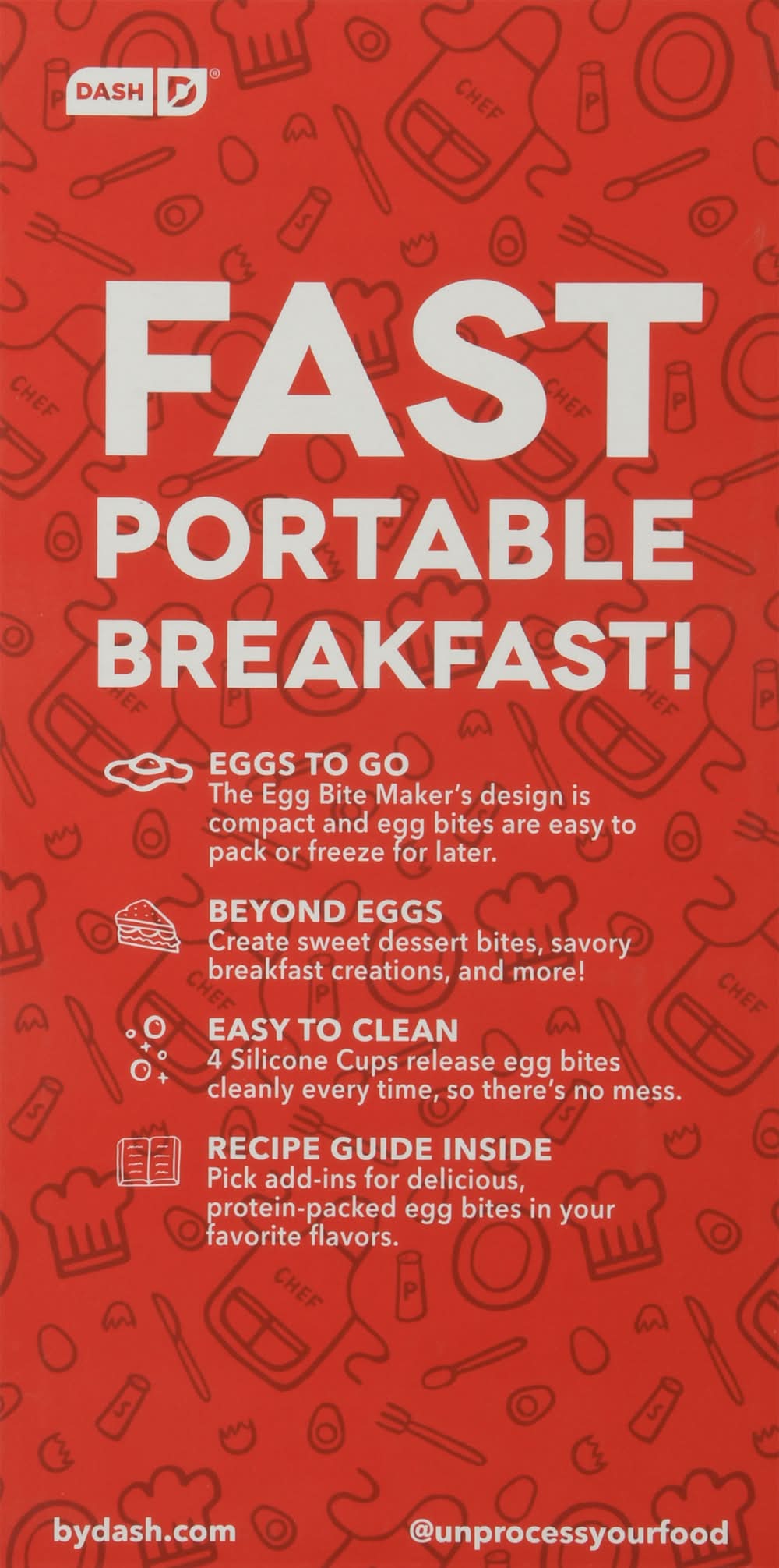 Average per serving 12 grams of protein. Keto. Gluten free. Paleo. Makes 4 egg bites. 420 watts. For a protein packed lifestyle! Keto. Gluten free. Vegetarian. Paleo. Eggs to go: The egg bite maker's design is compact and egg bites are easy to pack or freeze for later. Beyond eggs: Create sweet dessert bites, savory breakfast creations, and more! Easy to clean: 4 silicone cups release egg bites cleanly every time, so there's no mess. Recipe guide inside: Pick add-ins for delicious, protein-packed egg bites in your favorite flavors. Eat Good. Feel good. UL listed. bydash.com. storebound.com. (at)unprocessyourfood. Support hotline 1-800-898-6970 visit bydash.com. Made in China. Storebound LLC,