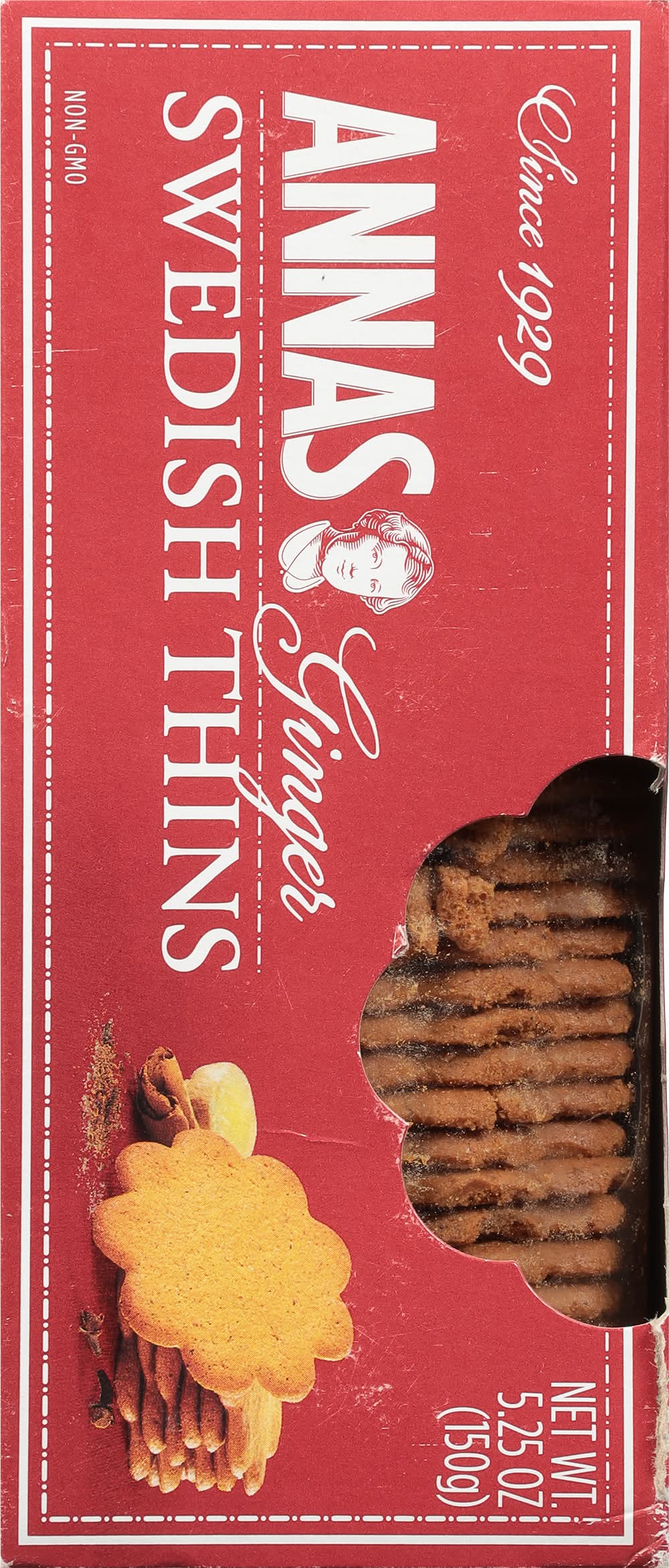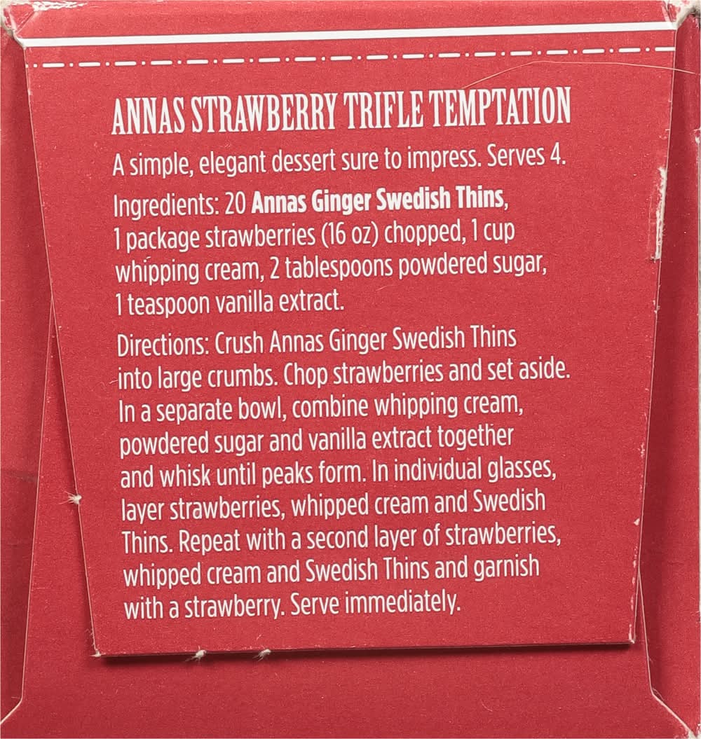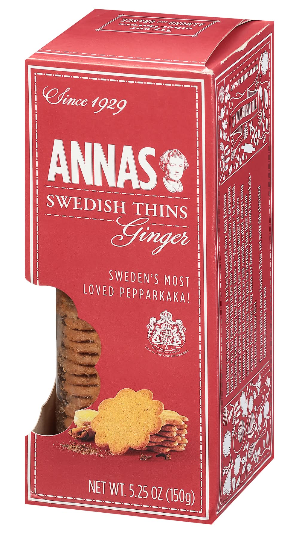 Non-GMO. Since 1929. Sweden's most loved pepparkaka! By the appointment to H.M. The king of Sweden. Some things you just don't change. A lot has happened since Ana Karlsson baked her very first Swedish Thin in her little backstreet bakery in downtown Stockholm, Sweden. Today her Swedish Thins, or Pepparkakor in Swedish, are known all over the world. It is still her wonderful mixture of spices: cinnamon, ginger and cloves. They are still carefully crafted, always using traditional baking trays which gives the Swedish Thins their delicate crispness. Perhaps that's why Annas are Sweden's most loved Pepparkaka -and have been since 1929. Treat your family to Annas Swedish Thins, and make this cherished Swedish tradition your own. www.lotusbiscoff.com. www.annas.se. Find inspiration at: www.annas.se. Try our other flavors almond and orange. Product of Sweden. Ab annas pepparkakor, 1000 Sansome St.,Suite 220,San Francisco,CA,94111