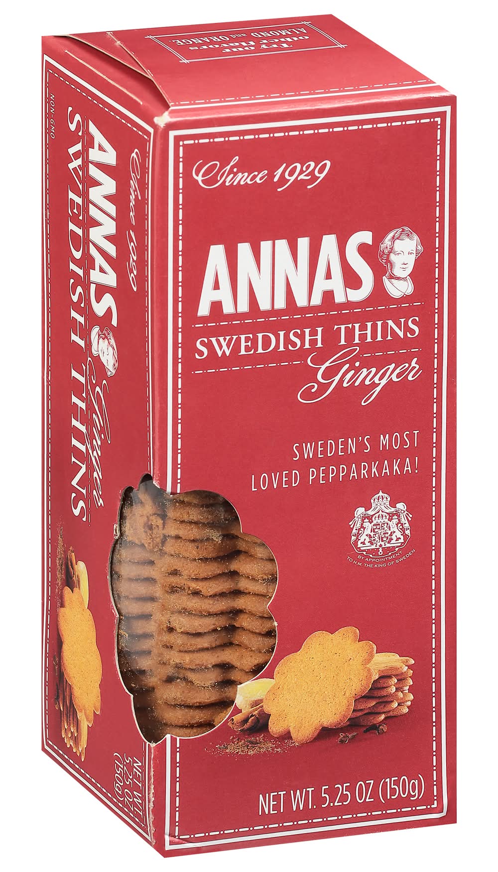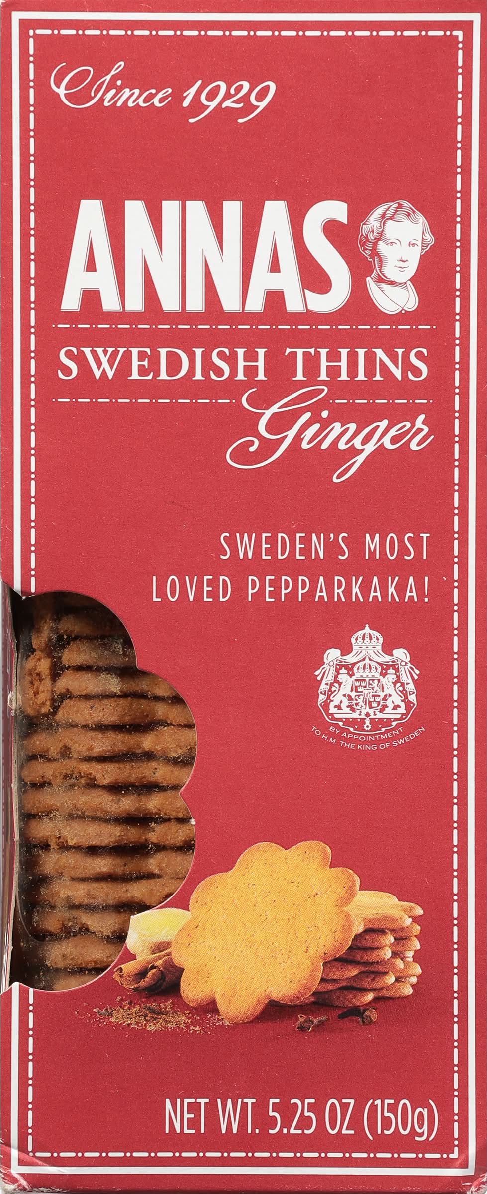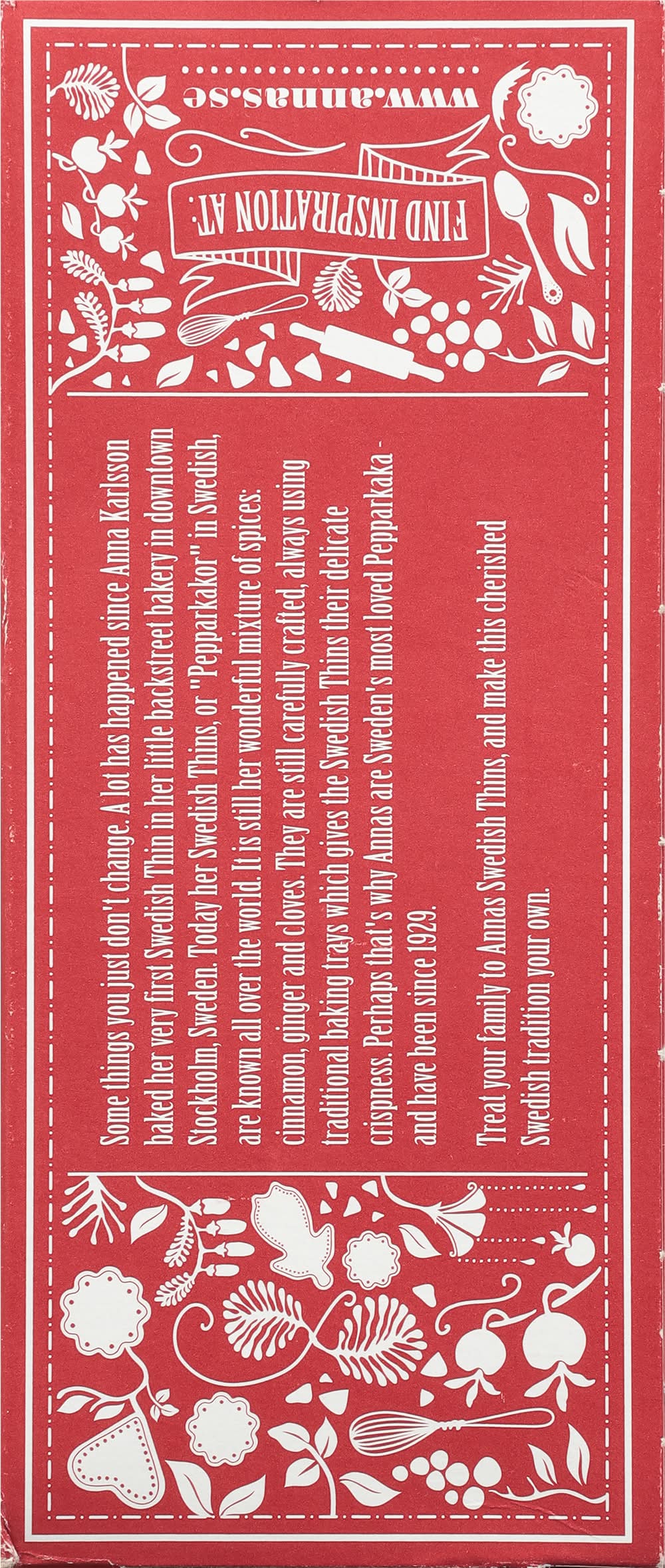 Non-GMO. Since 1929. Sweden's most loved pepparkaka! By the appointment to H.M. The king of Sweden. Some things you just don't change. A lot has happened since Ana Karlsson baked her very first Swedish Thin in her little backstreet bakery in downtown Stockholm, Sweden. Today her Swedish Thins, or Pepparkakor in Swedish, are known all over the world. It is still her wonderful mixture of spices: cinnamon, ginger and cloves. They are still carefully crafted, always using traditional baking trays which gives the Swedish Thins their delicate crispness. Perhaps that's why Annas are Sweden's most loved Pepparkaka -and have been since 1929. Treat your family to Annas Swedish Thins, and make this cherished Swedish tradition your own. www.lotusbiscoff.com. www.annas.se. Find inspiration at: www.annas.se. Try our other flavors almond and orange. Product of Sweden. Ab annas pepparkakor, 1000 Sansome St.,Suite 220,San Francisco,CA,94111