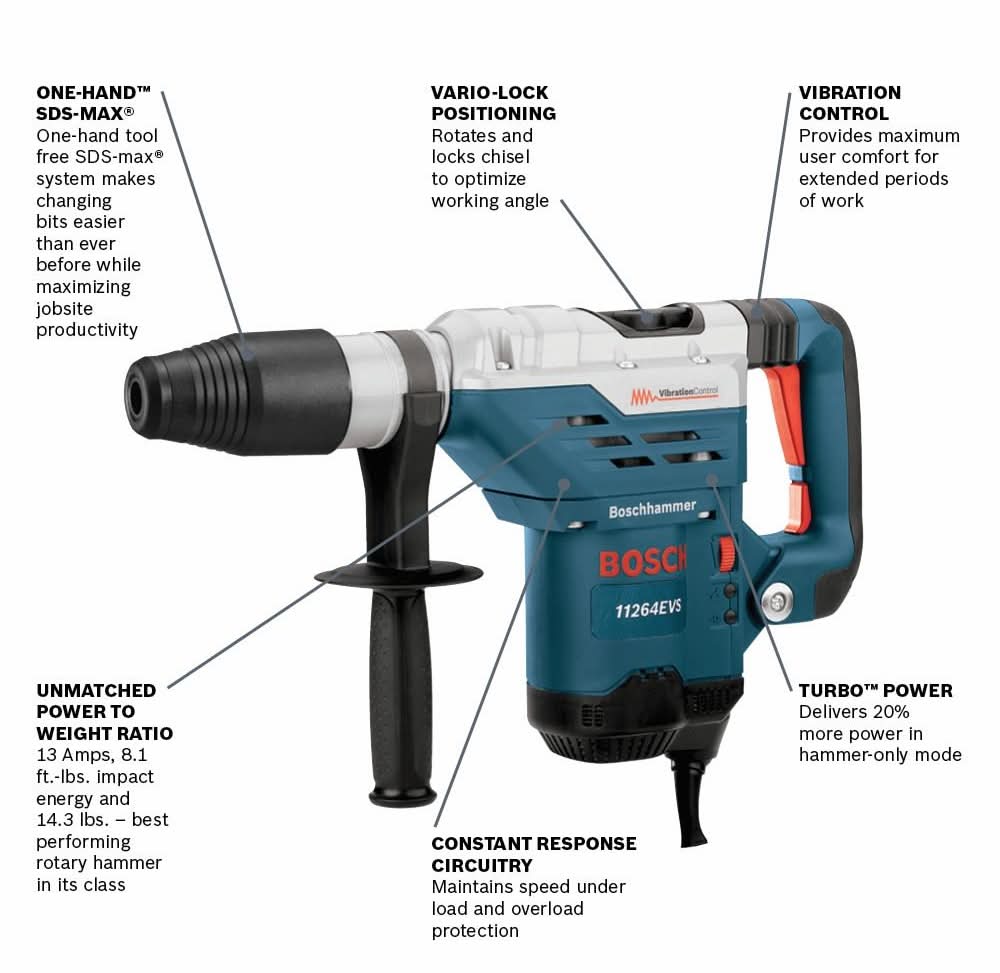 Powerful 13 Amp motor – drives 6-1/2 Ft-Lbs of impact energy for professional results. Vibration Control – for all day jobs, tool allows for maximum user comfort. Constant Response circuitry — provides soft-start and maintains constant speed under load. Turbo Power — delivers 20 percent more power in hammer-only mode. Electro-pneumatic impact system maximizes impact force and minimizes vibration. SDS-max® bit system — tool-free bit changes with automatic bit-locking and maximum impact energy transfer rate. Dual-mode selector — Two modes of operation, rotary hammer and hammer only mode. Variable-speed dial — for accurate bit starting and controlled chipping applications. Vario-Lock positioning — rotates and locks chisel into 12 different positions to optimize working angle. Color: Blue