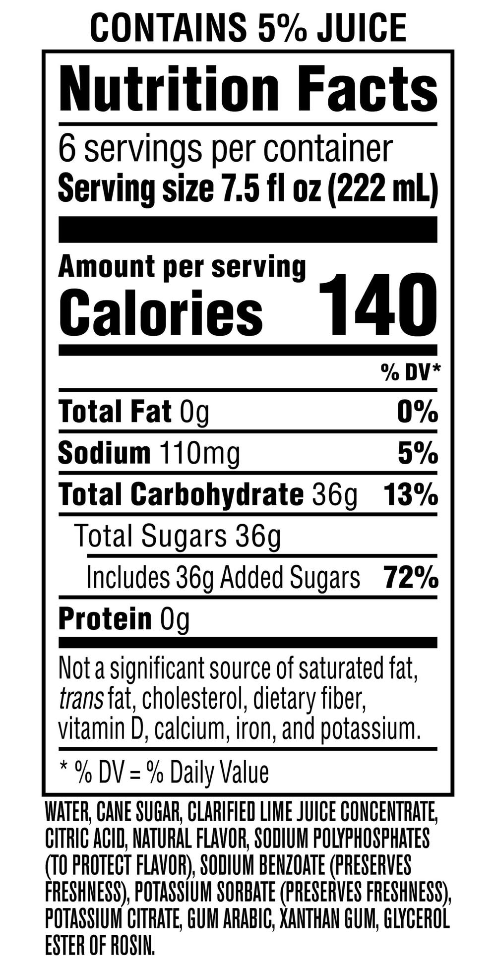 Water, Cane Sugar, Clarified Lime Juice Concentrate, Citric Acid, Natural Flavor, Sodium Polyphosphates (To Protect Flavor), Sodium Benzoate (Preserves Freshness), Potassium Sorbate (Preserves Freshness), Potassium Citrate, Gum Arabic, Xanthan Gum, Glycerol Ester Of Rosin.