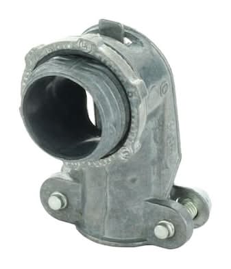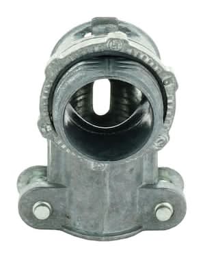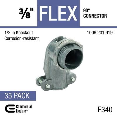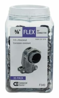 Commercial Electric's 1/2 in knockout 90° Connectors are used with a locknut to terminate steel or aluminum Flexible Metal Conduit (FLEX) and armored cable (AC) to enclosure. Smooth gradual 90° radius bend allows for easy wiring with no sharp edges. Fast and easy installation - simply loosen screws partway to lift off cap. All malleable construction ensures mechanical protection for the raceway. Zinc-electroplated for added corrosion protection.