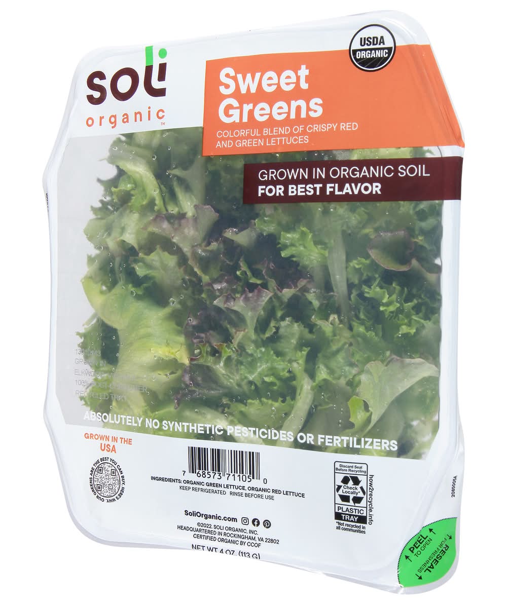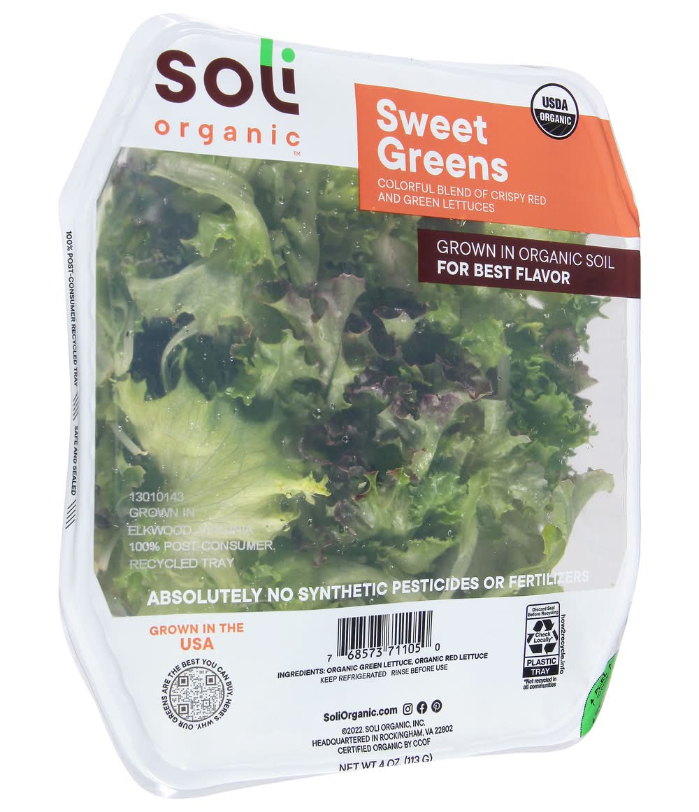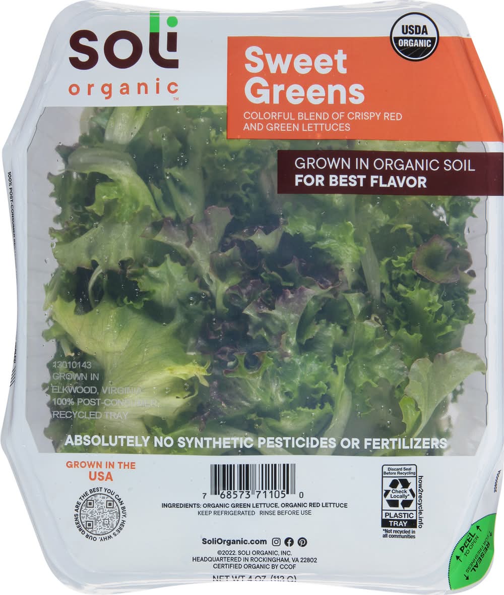 Colorful blend of crispy red and green lettuces. USDA Organic. Certified Organic by CCOF. Grown in organic soil for best flavor. Absolutely no synthetic pesticides or fertilizers. SoliOrganic.com. how2recycle.info. SoliOrganics.com. Instagram. Facebook. Pinterest. Our greens are the best you can buy, here's why. 100% post-consumer recycled tray. Safe and sealed. Our greens are the best you can buy, here's why. Grown in the USA. Grown in Elkwood, Virginia. • Soli Organic, Inc., • Packaging: Reusable