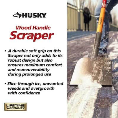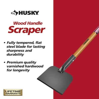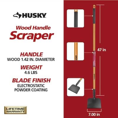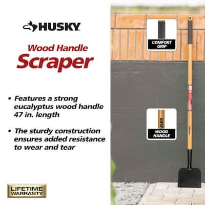 The Husky 7 in. Sidewalk Scraper is designed to make light work of all your scraping needs. This durable, long-lasting tool is perfect for removing ice, hardened dirt, and tackling various landscaping tasks with ease. With its multi-purpose functionality, it can be used to remove roofing, siding and flooring or other garden debris. It's also great for digging, clearing trenches and lawn edging. With its electrostatic powder coating, the blade not only remains rust-resistant but also retains its sharpness and integrity for a longer time. The 7 in. scraper features a premium varnished eucalyptus hardwood handle, providing extra strength, durability, and a comfortable grip, even during prolonged use. The additional length offers increased leverage, making it easier to handle various materials and complete your outdoor tasks effortlessly. At Husky, we stand behind the quality and durability of our products, which is why we offer a manufacturer lifetime warranty. Size: 47 In