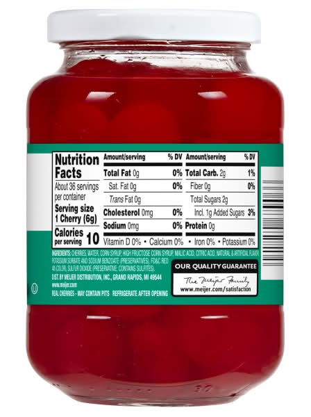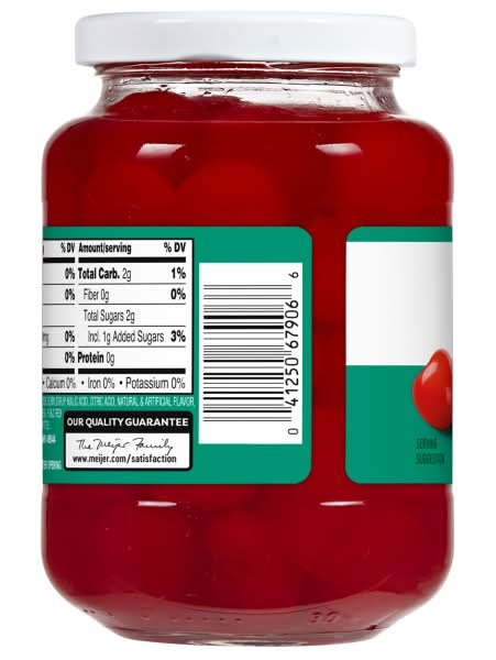 Meijer Red Maraschino Cherries are designed to enhance a variety of drinks and dishes with their luxuriously smooth and rich texture, adding a sweet twist that is memorable for its flavor profile. These cherries are suitable for use in cocktails like Old Fashions and as a topping for ice cream sundaes.