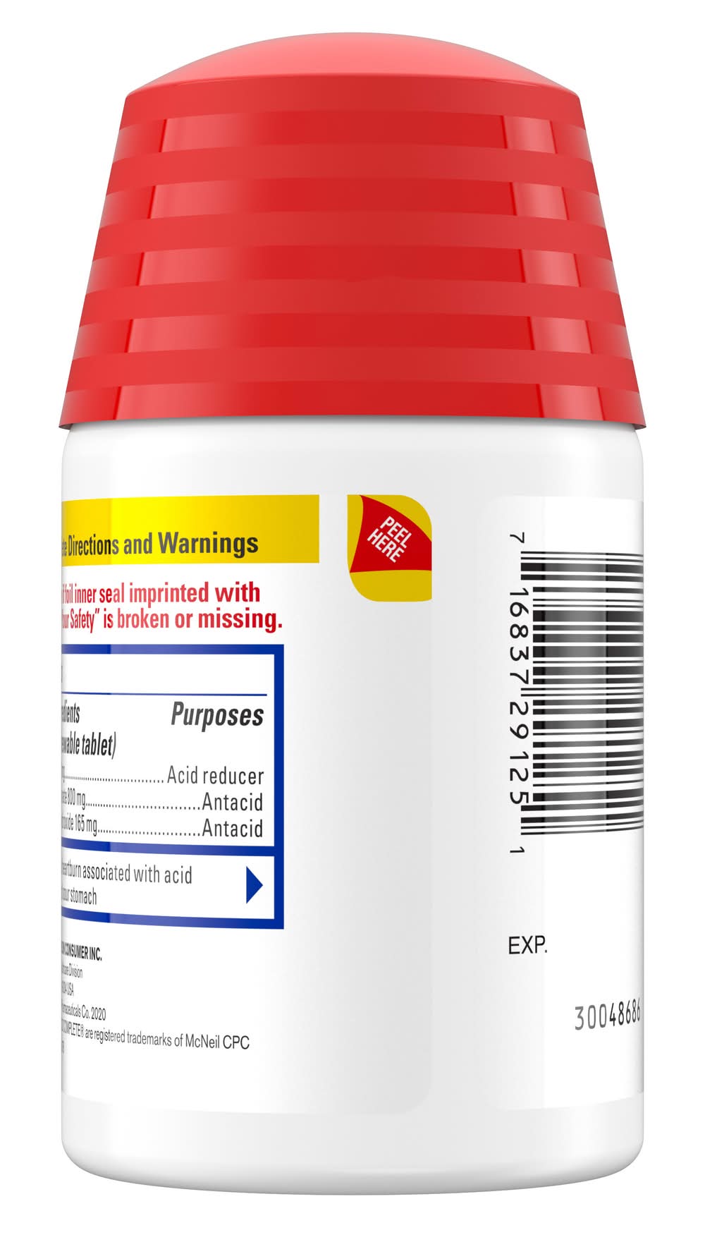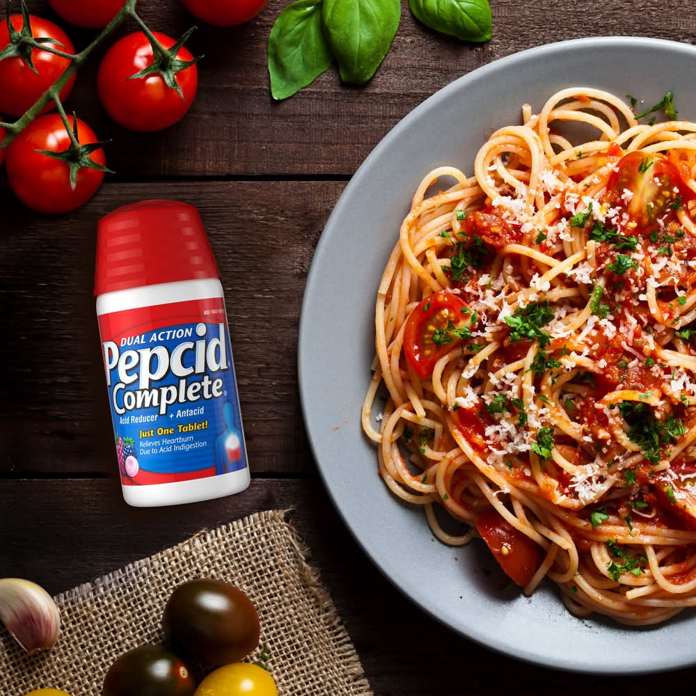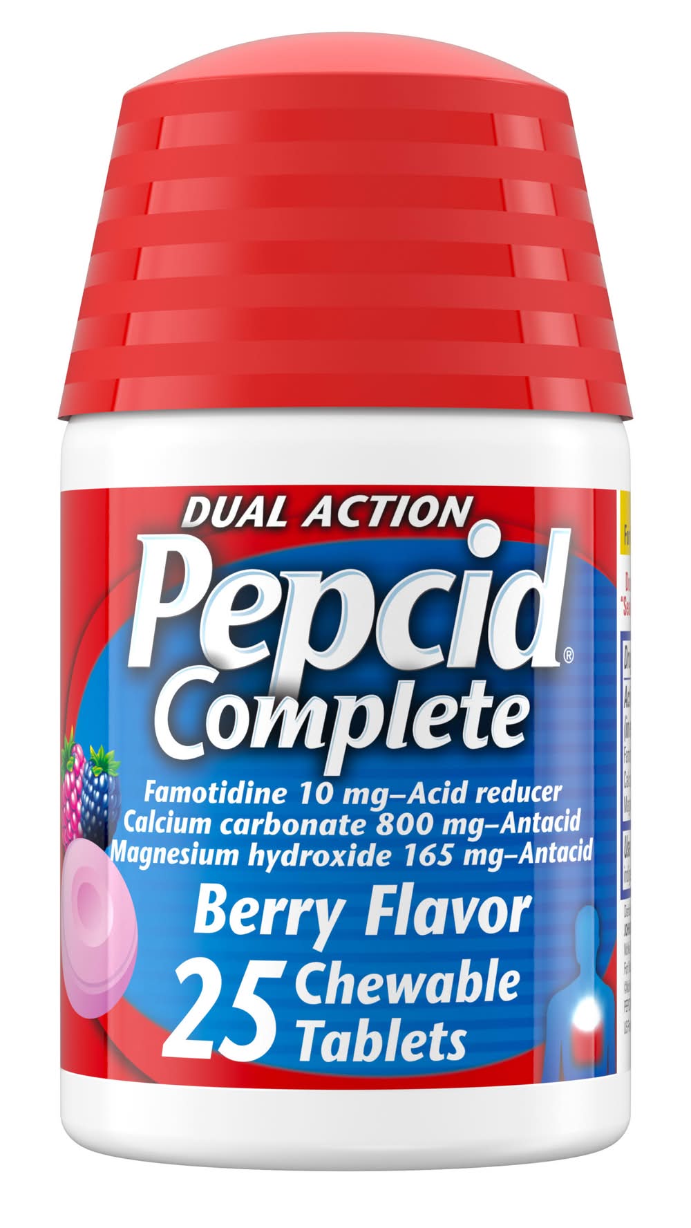 Quickly relieve heartburn and reduce acid associated with acid indigestion and sour stomach with Pepcid Complete Acid Reducer + Antacid Chewable Tablets. These berry flavored heartburn relief antacid chews combine a fast-working antacid and long-lasting acid reducer to help control acid all day or all night.* Formulated with 10 mg of the acid reducer famotidine, 800 mg of the antacid calcium carbonate and 165 mg of the antacid magnesium hydroxide per tablet, this heartburn reliever helps to neutralize and control acid. The dual-action formula starts working in seconds and lasts longer than Tums. Whether at brunch or a new food spot, use Pepcid Complete Berry Chewables for fast-acting heartburn relief so you don't have to worry about hurting now or hurting later. * Based on 9-hour acid control studies during the day and 12-hour acid control studies during the night. Acid control does not imply symptom relief. Tums is a registered trademark of GlaxoSmithKline Johnson & Johnson Consumer Inc., Fort Washington, PA, 19034,