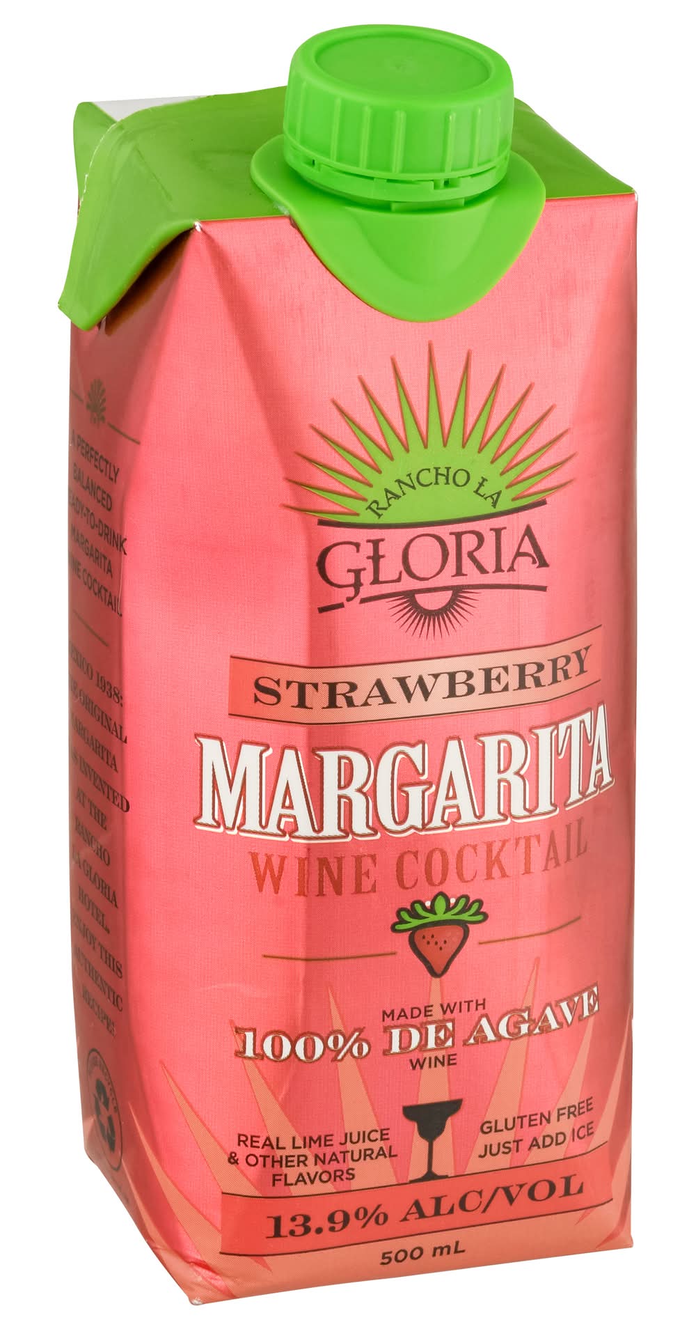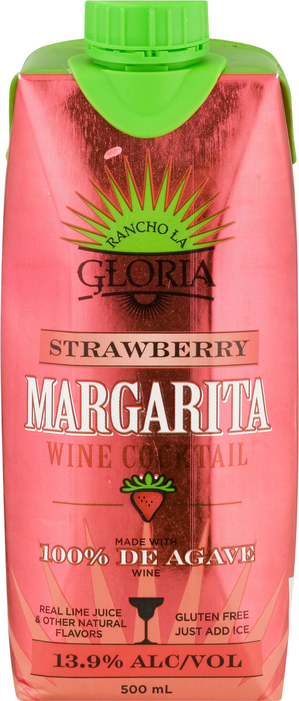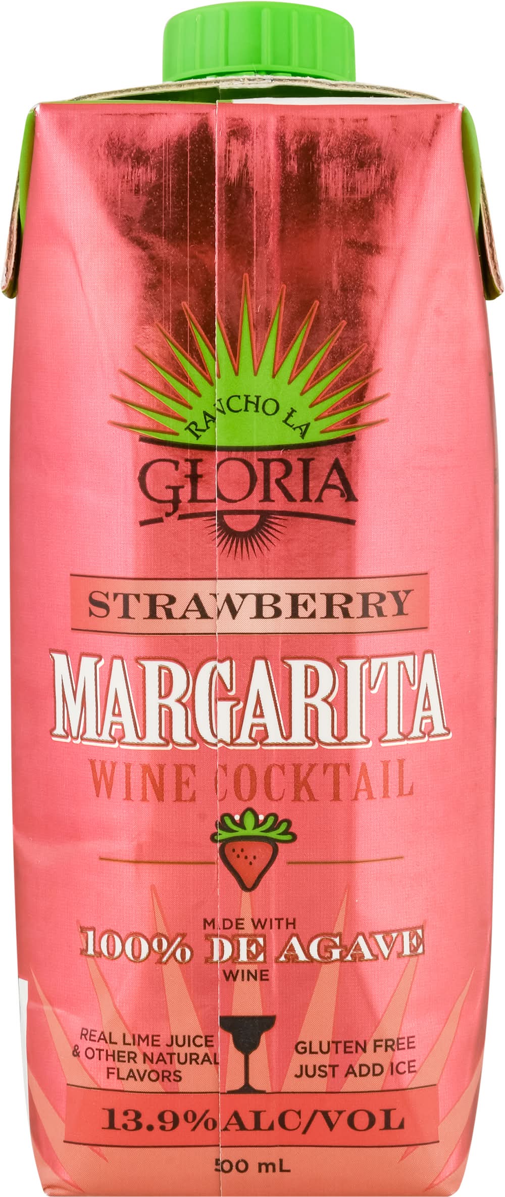 Limited Edition Wine cocktail. Real lime juice. Natural flavors. Margarita made with 100% de agave wine. Ready to drink. Hand crafted. Mexico 1938 the original Margarita was invented at the Rancho La Gloria Hotel. Enjoy this authentic recipe! Margarita wine cocktail agave wine with natural flavors and certified color. rancholagloria.com. 13.9% alc./vol. 27.8 Produced and Bottled by MPL Brands, Mira Loma, CA 91752. • Brand: Rancho la gloria • Flavor: Strawberry • Alcohol by volume: 13.9%