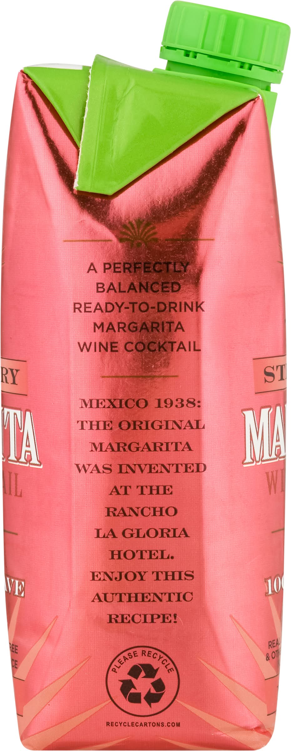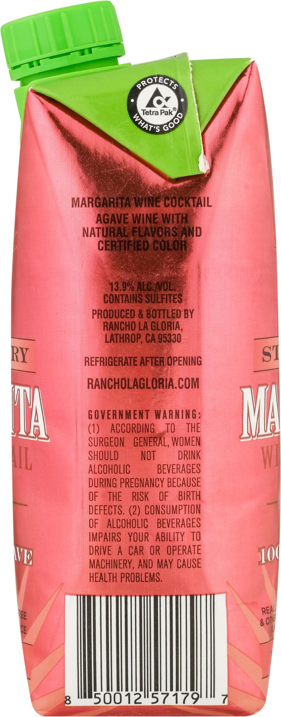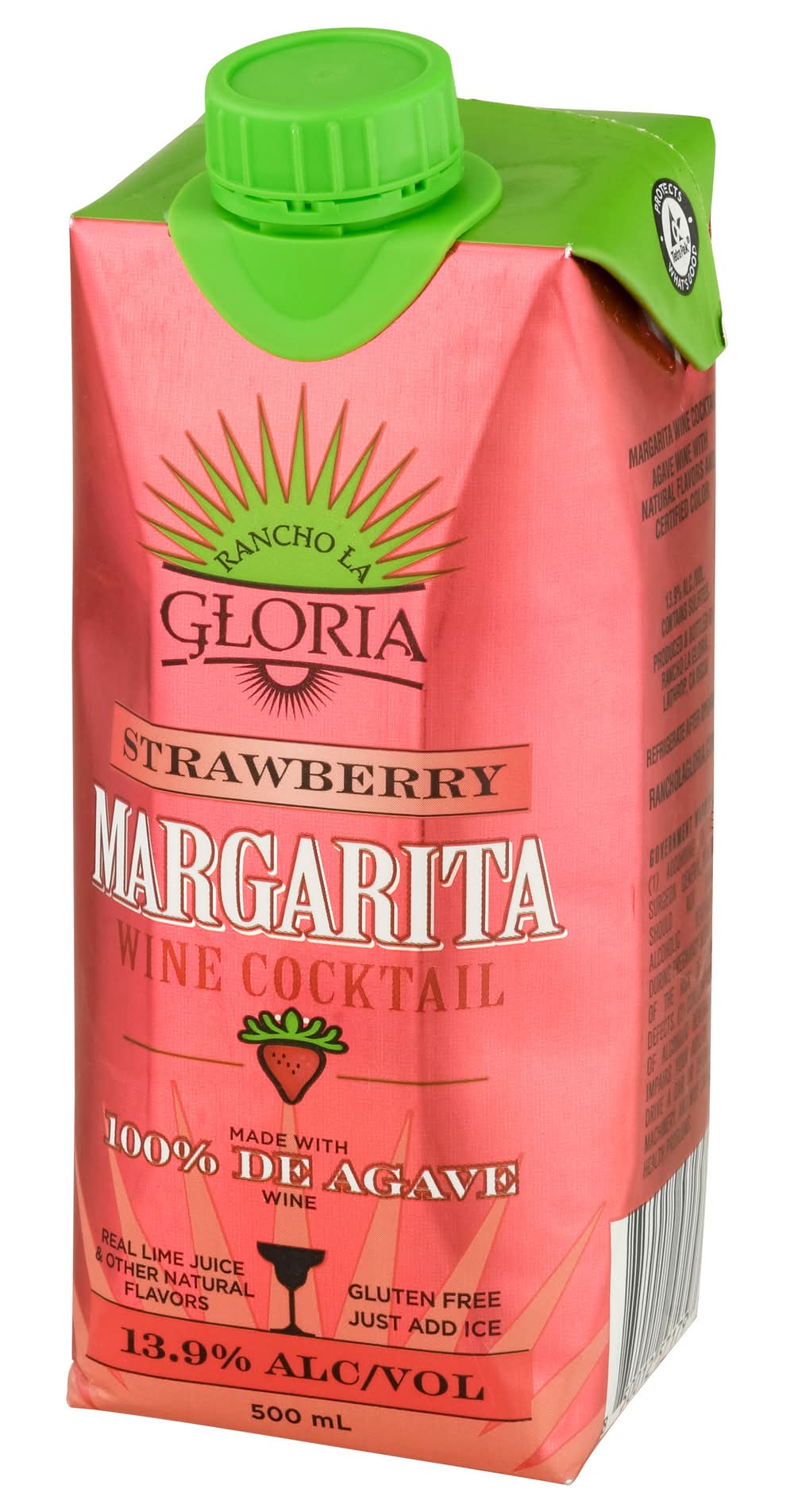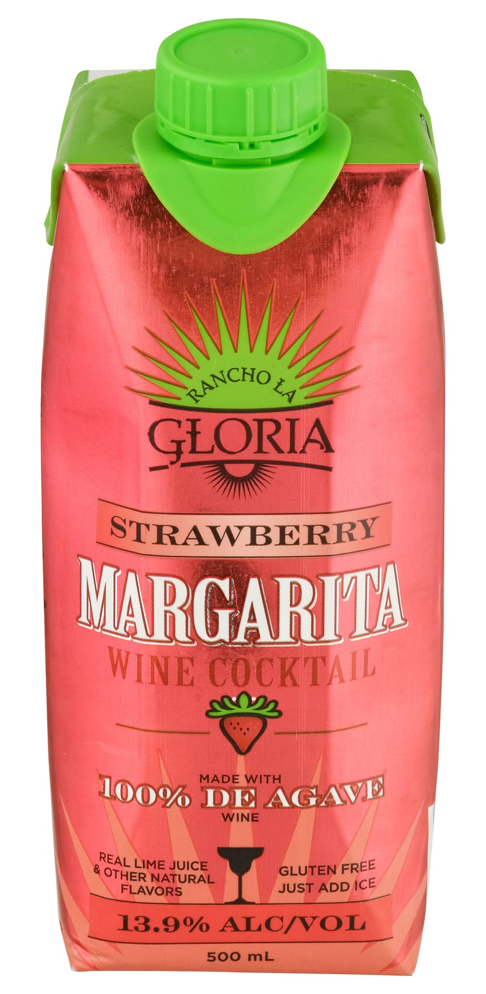 Limited Edition Wine cocktail. Real lime juice. Natural flavors. Margarita made with 100% de agave wine. Ready to drink. Hand crafted. Mexico 1938 the original Margarita was invented at the Rancho La Gloria Hotel. Enjoy this authentic recipe! Margarita wine cocktail agave wine with natural flavors and certified color. rancholagloria.com. 13.9% alc./vol. 27.8 Produced and Bottled by MPL Brands, Mira Loma, CA 91752. • Brand: Rancho la gloria • Flavor: Strawberry • Alcohol by volume: 13.9%