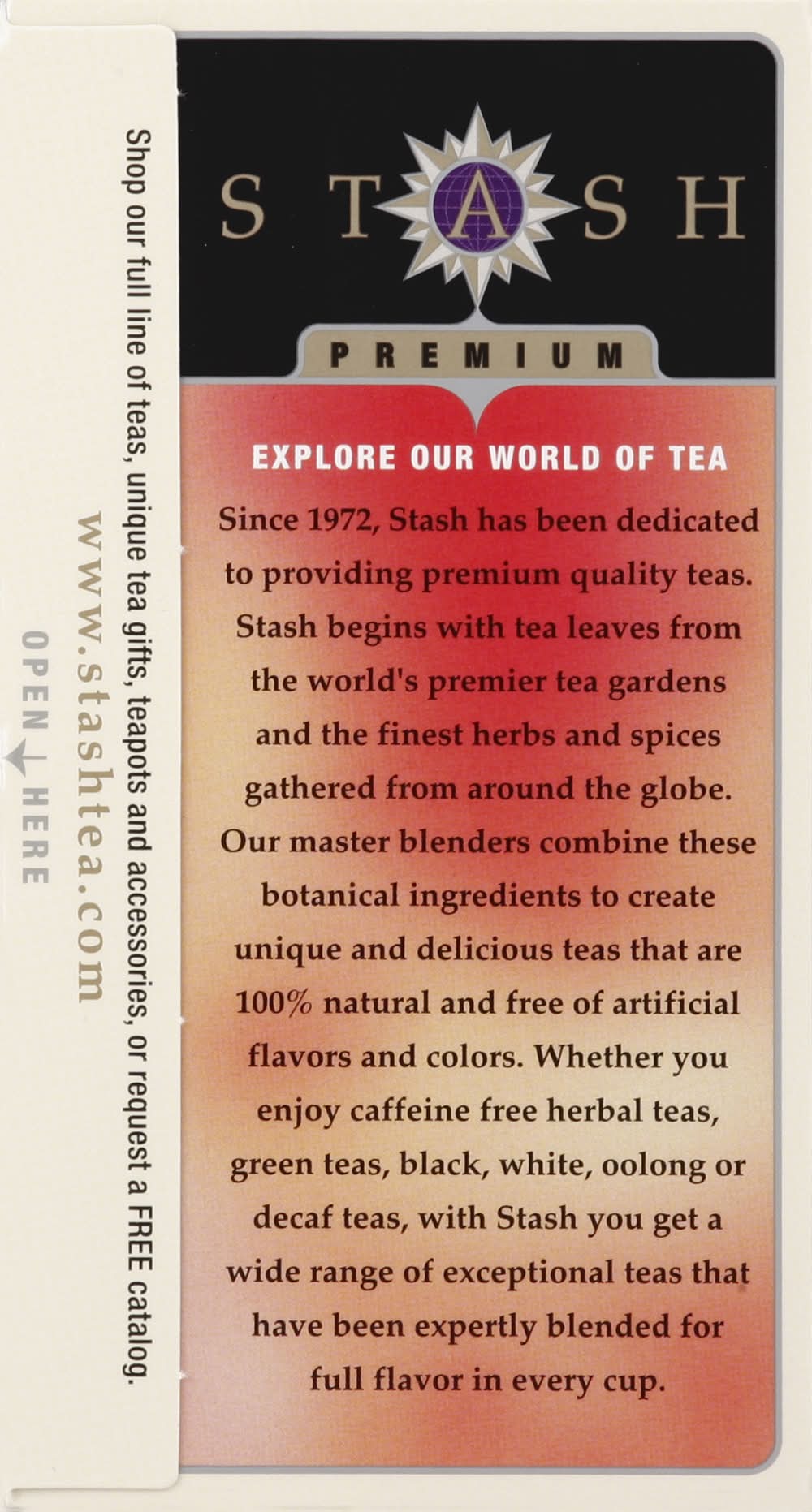 Premium. A world of tea. Explore our world of tea. Since 1972, Stash has been dedicated to providing premium quality teas. Stash begins with tea leaves from the world's premier tea gardens and the finest herbs and spices gathered from around the globe. Our master blenders combine these botanical ingredients to create unique and delicious teas that are 100% natural and free of artificial flavors and colors. Whether you enjoy caffeine free herbal teas, green teas, black, white, oolong or decaf teas, with Stash you get a wide range of exceptional teas that have been expertly blended for full flavor in every cup. Shop our full line of teas, unique tea gifts, teapots and accessories, or request a free catalog. www.stashtea.com. Oolong is between black and green tea in taste and color. The best oolong tea in the world grows in the mists and fertile ground of the Wuyi Mountains of China's Fujian Province. Our luscious White Peach Oolong blends this remarkable tea with ripe, juicy, 100% natural peach flavor - truly a delight for the senses. Savor our White Peach Oolong - it's like an afternoon on the porch. 100% natural ingredients. Sustainable Forestry Initiative - certified sourcing. www.sfiprogram.org. Recyclable. • Stash Tea Company, • Packaging: Reusable