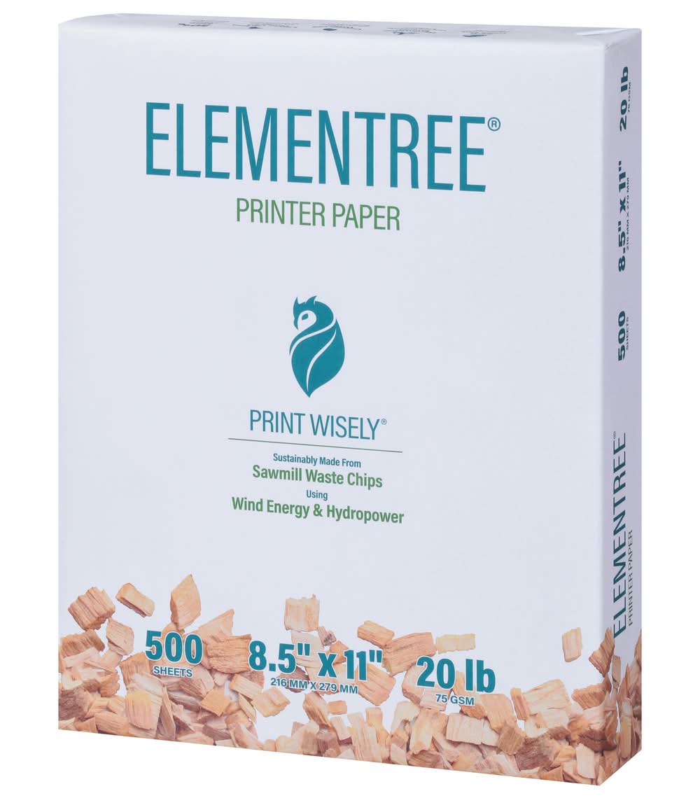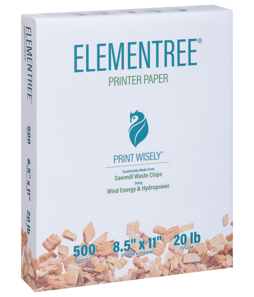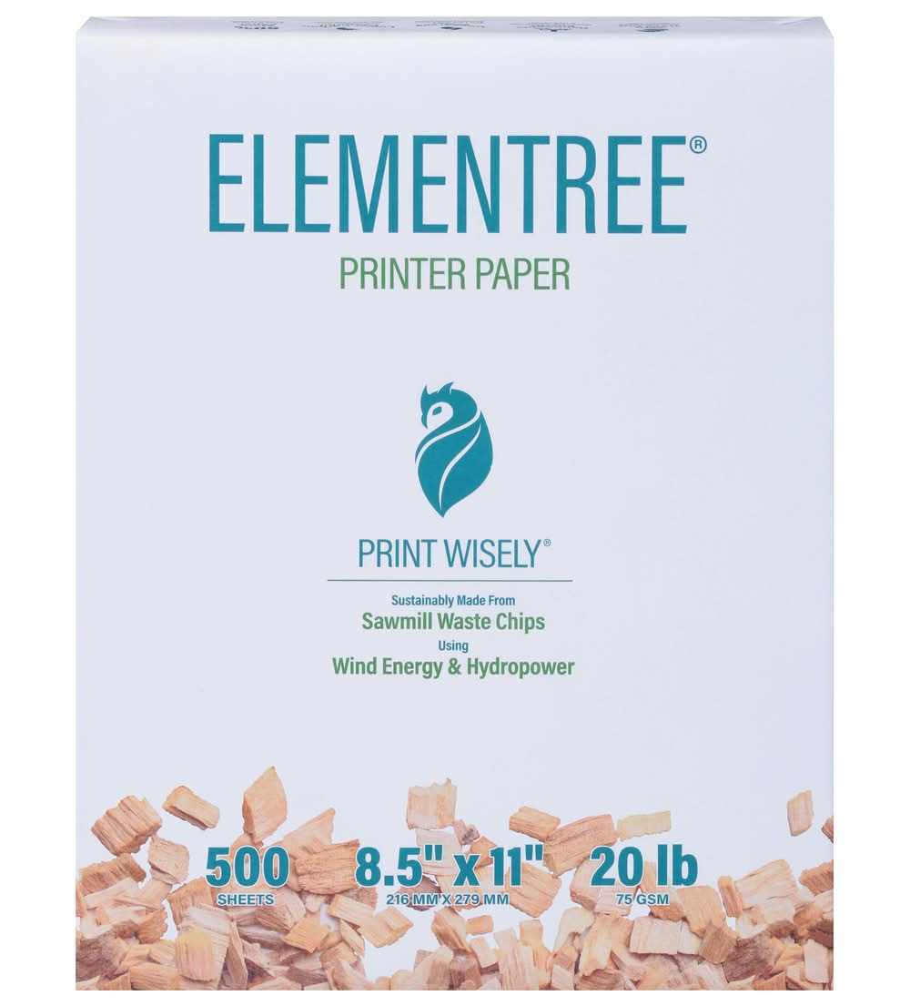 Looking for an affordable copy paper that is sustainable for everyday use? Elementree Printer Paper is the affordable paper option for use at home, school and in the office. It’s great for everyday printing such as emails, reports, presentations, research, class assignments and more! And by, choosing Elementree, you are supporting a sustainable process that has a low impact on the environment as well as your budget! Wondering how? Elementree is made from sawmill waste chips with a pulping process that yields 50% more paper from the same amount of wood as compared to standard copy paper. The paper making process is also driven by wind & hydro power which uses 47% less water and generates about half the carbon footprint of standard copy paper. A low cost, low impact, sustainable printer paper that is thicker than normal copy paper. What a deal! Our eco-friendly paper features a high opacity which limits show through for double-sided printing that reduces paper usage/impact on environment. Smooth, finish runs easily on personal printers, high speed office laser printers, and inkjet copiers. PRINT WISELY with Elementree Printer Paper, the wise choice for your every day paper copying and printing need. Color: White