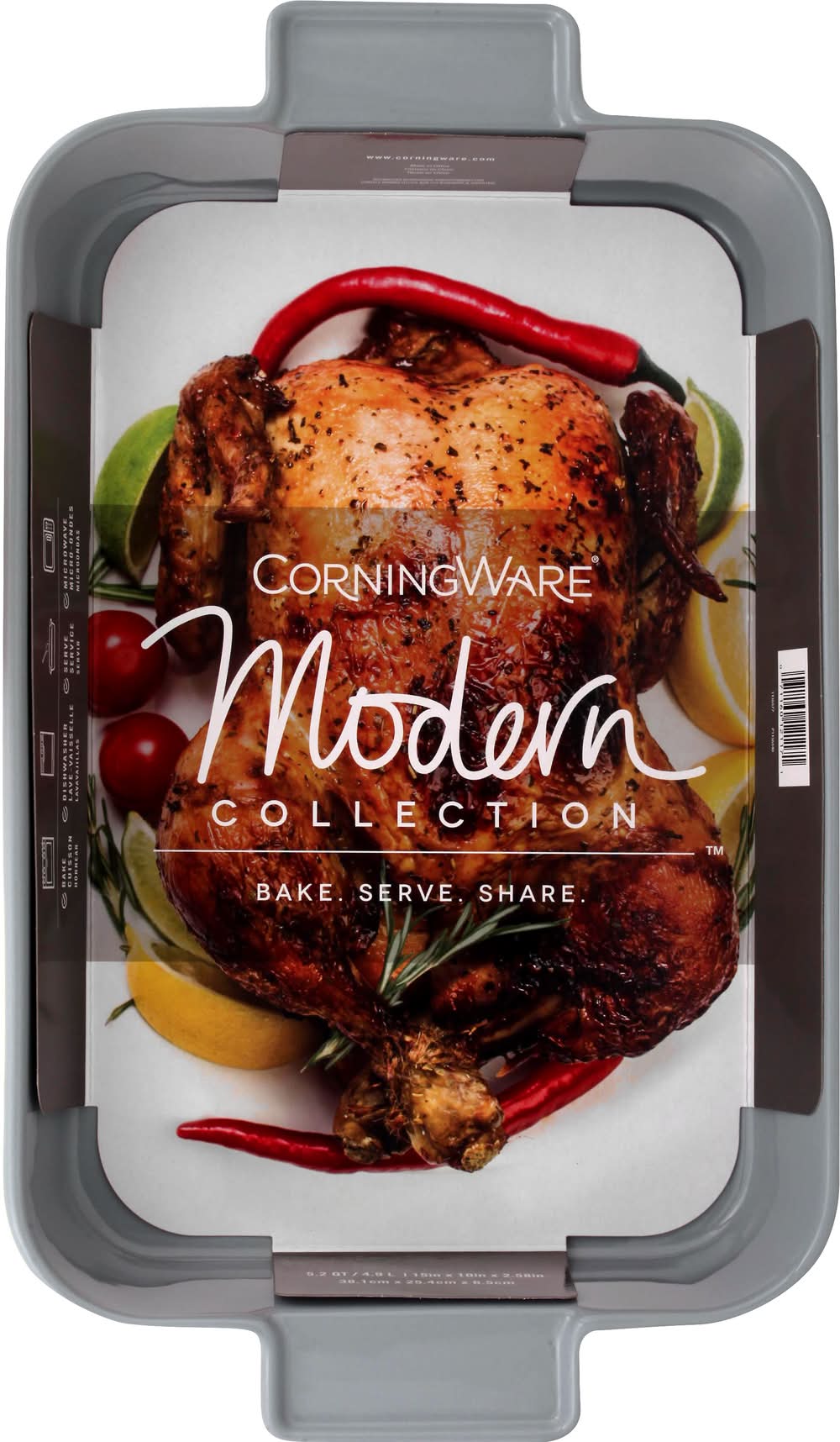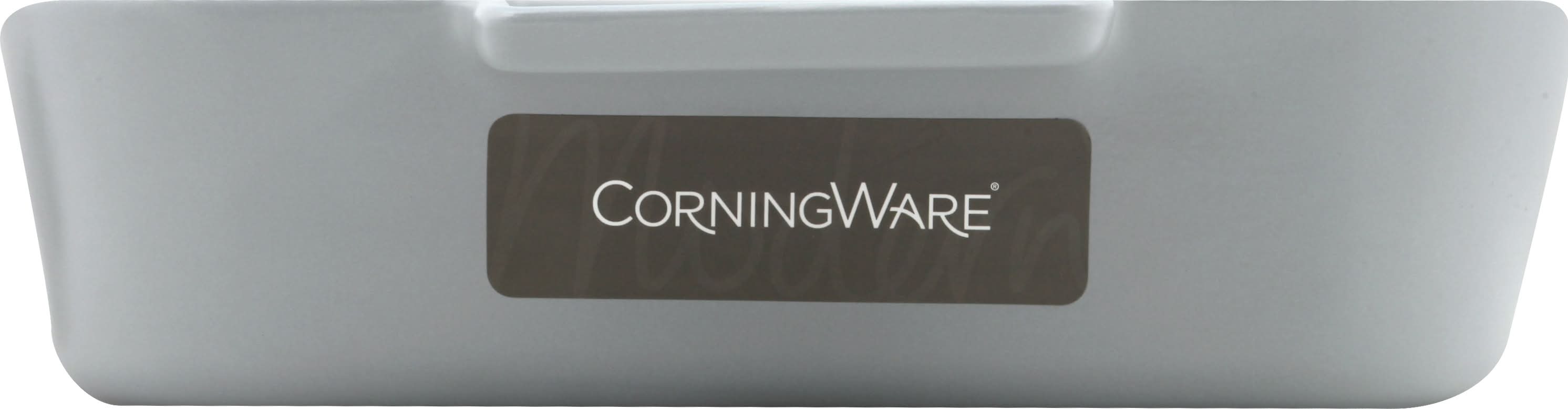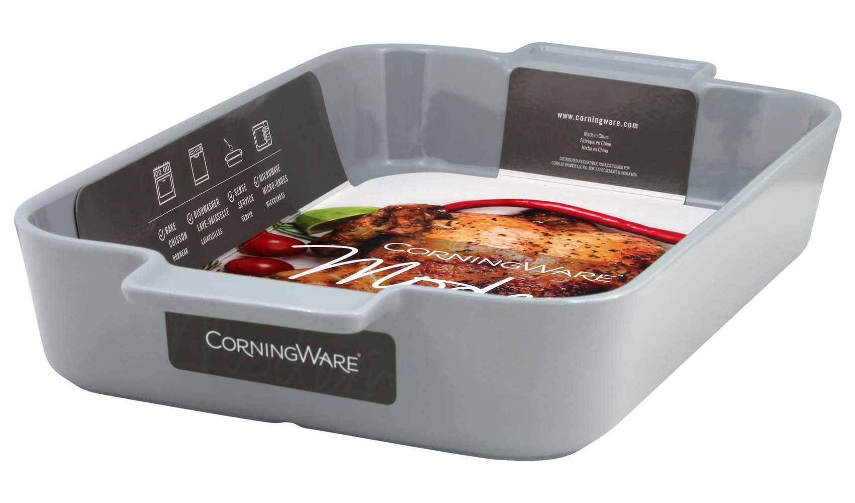 Modern collection. Bake. Serve. Share. Dishwasher. Serve. Microwave. 5.2 qt / 4.9 l. 15 in x 10 in x 2.58 in. 38.1 cm x 25.4 cm x 6.5 cm. 10 x 15 in / 25.4 x 38.1 cm. No stovetop. No broiler. Microwave & oven safe. www.corningware.com Made in China. Corelle Brands,