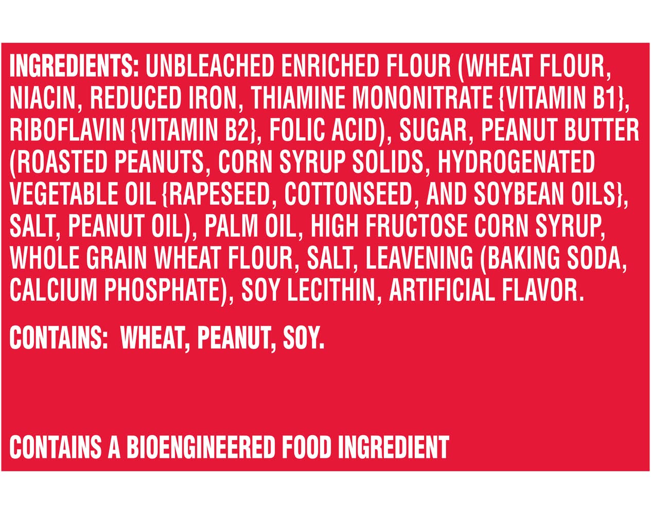 Ingredients: INGREDIENTS: UNBLEACHED ENRICHED FLOUR (WHEAT FLOUR, NIACIN, REDUCED IRON, THIAMINE MONONITRATE {VITAMIN B1}, RIBOFLAVIN {VITAMIN B2}, FOLIC ACID), SUGAR, PEANUT BUTTER (ROASTED PEANUTS, CORN SYRUP SOLIDS, HYDROGENATED VEGETABLE OIL {RAPESEED, COTTONSEED, AND SOYBEAN OILS}, SALT, PEANUT OIL), SOYBEAN AND/OR CANOLA OIL, WHOLE GRAIN WHEAT FLOUR, HIGH FRUCTOSE CORN SYRUP, PALM OIL, SALT, LEAVENING (BAKING SODA, CALCIUM PHOSPHATE), SOY LECITHIN, ARTIFICIAL FLAVOR.CONTAINS: WHEAT, PEANUT, SOY. Contains: Wheat, Peanuts, Soybeans