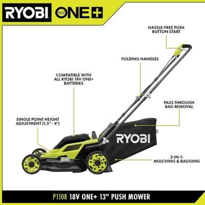 The RYOBI 18V ONE+ 13" Push Mower delivers the power to tackle small sized yards with ease. It's ideal for up to 1/4 acre and runs for up to 30 minutes with the included 18V ONE+ 4Ah battery. The single-point height adjustment allows you to quickly select the perfect height for your lawn with 7 different positions (1.5"-4"). With its easy lift bag removal and included mulch plug, switching between bagging and mulching is a breeze. When you are finished mo Cancer and Reproductive Harm www.P65Warnings.ca.gov
