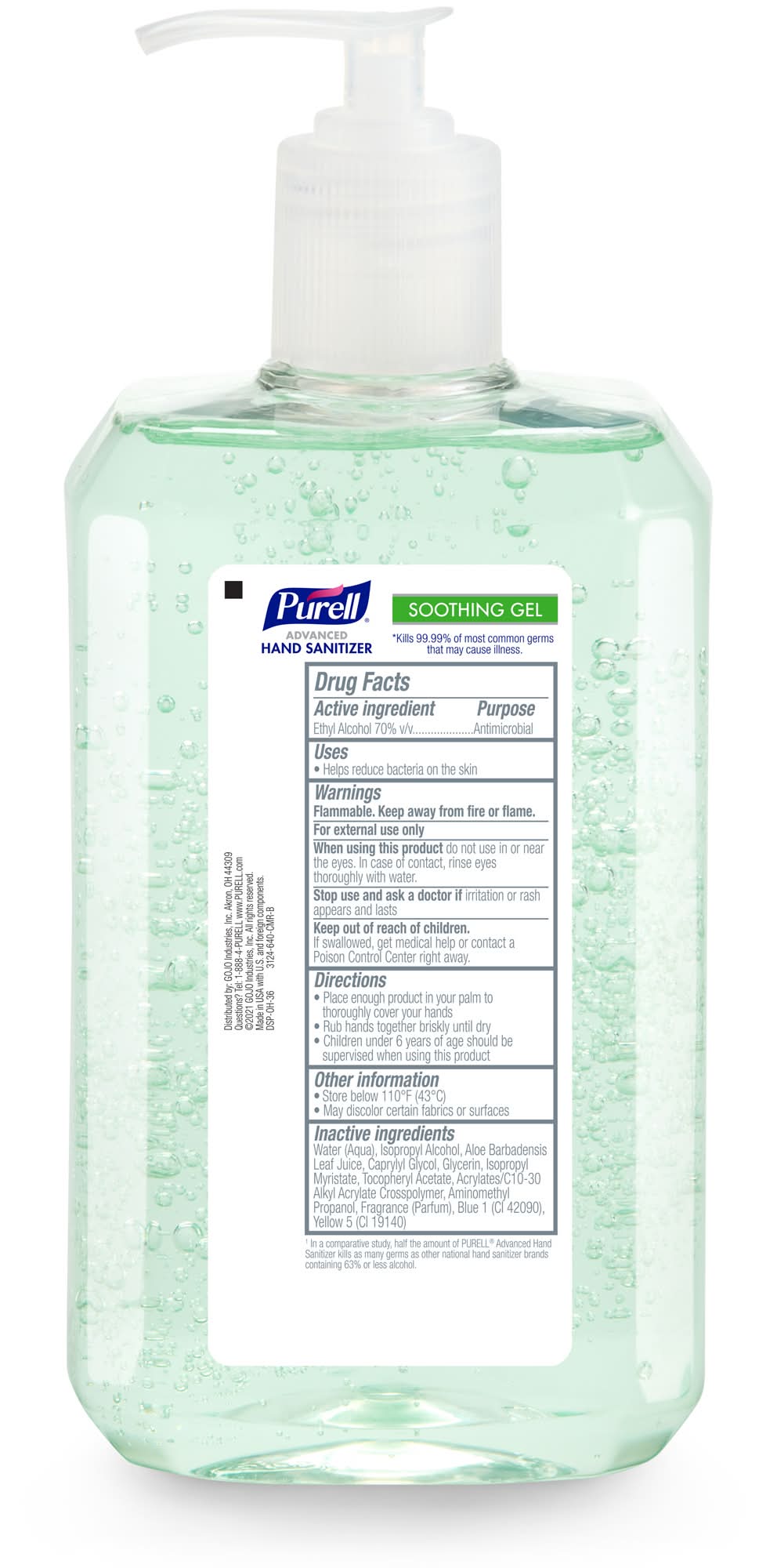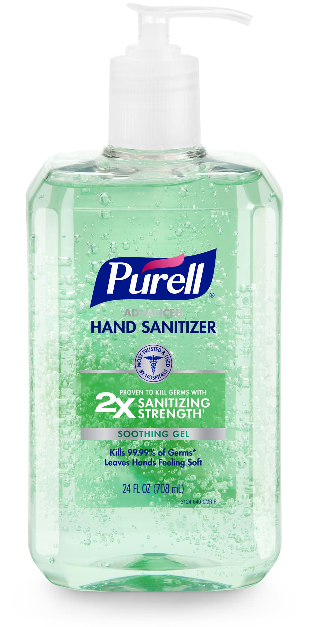 Purell Advanced soothing gel hand sanitizer is proven to kill germs with two times the sanitizing strength. Kills 99.99% of most common germs that may cause illness. Formulated with moisturizers and skin conditioners to keep hands soft. - 70% alcohol gel hand sanitizer helps reduce bacteria on the skin - Comes in 24 fl. oz. pump bottle - Ingredients: water, isopropyl alcohol, Aloe barbadensis leaf juice - Kills 99.99% of most common germs that may cause illness - Formulated with moisturizers and skin conditioners to keep hands soft - Most trusted and used by hospitals - This product is manufactured by a certified WBE (women owned business) - Safety Data Sheet