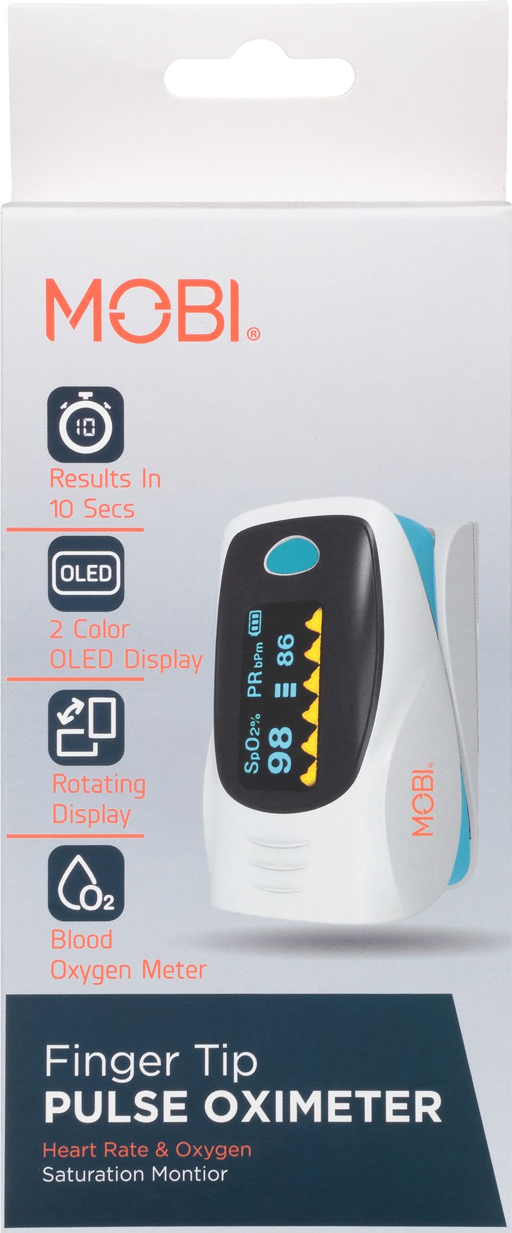 C101A2 Heart rate & oxygen saturation monitor. Result in 10 secs. 2 Color OLED display. Rotating display. Blood oxygen meter. Proactive: Low battery indicator lets you know before your batteries stop working. Bright & Compact - light weight, easy to carry & accommodates wide range of finger sizes. Package includes: Oximeter, 2x AAA batteries, 1 lanyard. 90 day warranty. Details inside. RoHS. FCC listed. 2 x AAA batteries. www.getmobi.com. Made in China. Mobi Technologies, Inc.,