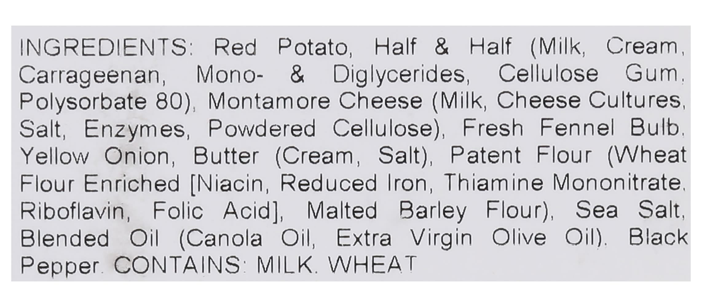 Red Potato, Half & Half (Milk Cream Carrageenan Mono- & Diglycerides Cellulose Gum Polysorbate 80), Montamore Cheese (Milk Cheese Cultures Salt Enzymes Powdered Cellulose), Fresh Fennel Bulb, Yellow Onion, Butter (Cream Salt), Patent Flour (Wheat Flour Enriched [Niacin Reduced Iron Thiamine Mononitrate Riboflavin Folic Acid] Malted Barley Flour), Sea Salt, Blended Oil (Canola Oil Extra Virgin Olive Oil), Black Pepper Contains: Milk, Wheat, Barley