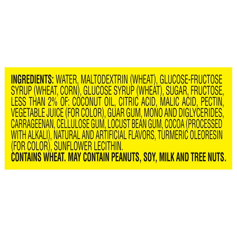 Ingredients: Water, Maltodextrin (Wheat), Glucose-Fructose Syrup (Wheat, Corn), Glucose Syrup (Wheat), Sugar, Fructose, Less than 2% of: Coconut Oil, Citric Acid, Malic Acid, Pectin Vegetable Juice (for Color), Guar Gum, Mono and Diglycerides, Carrageenan, Cellulose Gum, Locust Bean Gum, Cocoa (Processed with Alkali), Natural and Artificial Flavors, Turmeric Oleoresin (for Color), Sunflower Lecithin Contains: Wheat, Corn, Tree Nuts, Coconuts, Peanuts, Soybeans, Milk, Tree Nuts Additives: Artificial Flavors
