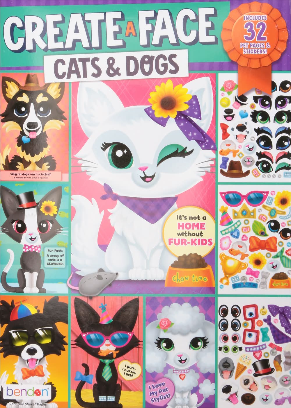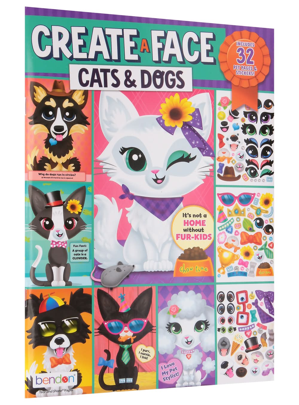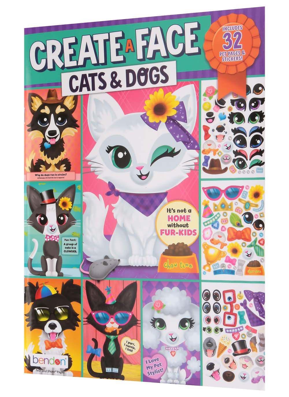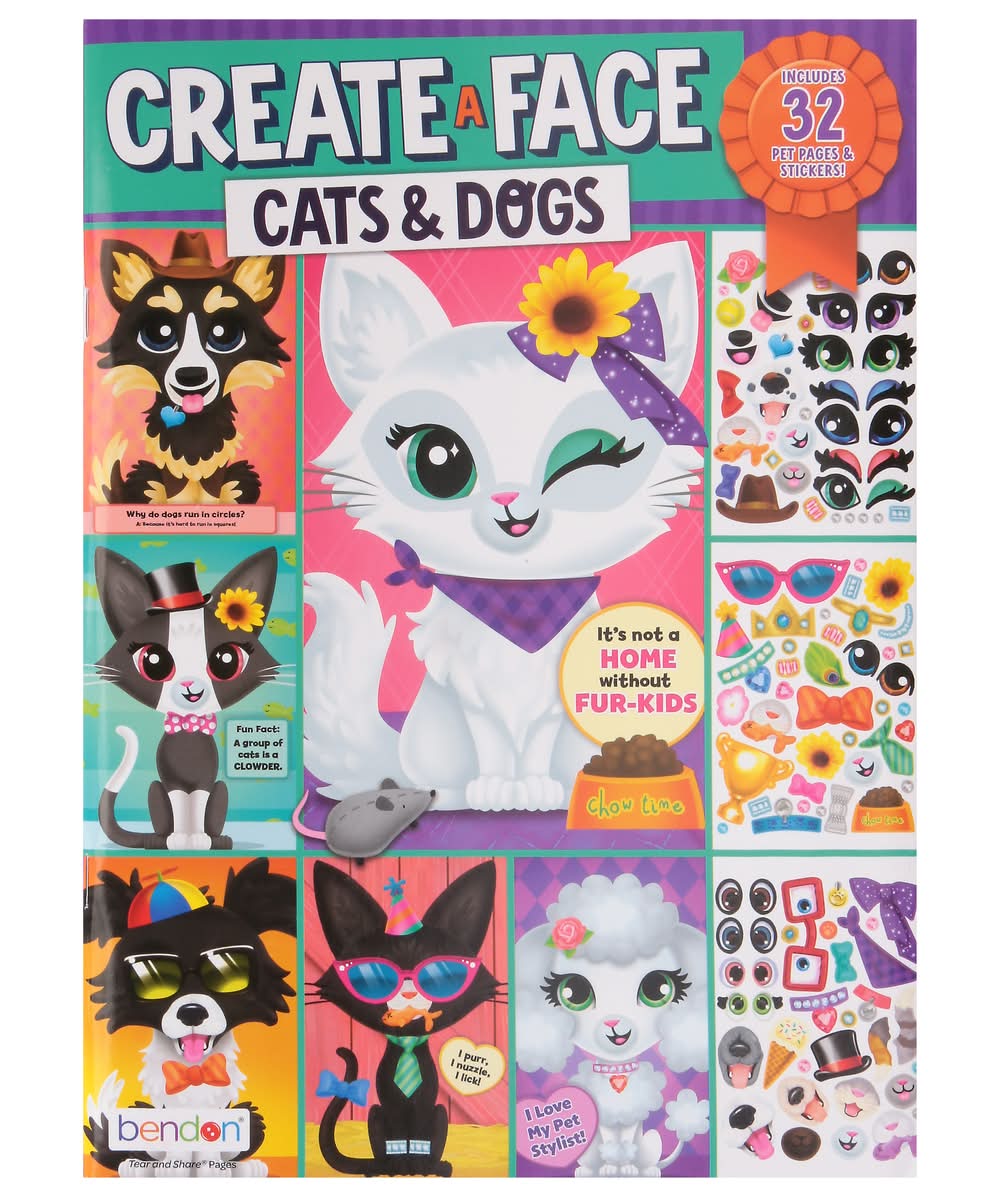 Ages 3+. Includes 32 pet ages & stickers. Why do dogs run in circles? Fun Fact: A group of cats is a clowder. Bendon tear and share pages. I purr, I nuzzle, I lick. I love my pet stylist. It’s not a home without fur-kids chow time. Catnip 10lbs. What does a cat like to eat for breakfast? A: Mick Kriagles. What do you call a dog magician? A: A labracadabrador. Stickers not intended for use on skin. Contributing illustrators: Lisa Wallace and heather brown. bendonpub.com. Follow us for free activities, contests crafts, and more! Facebook. bendoninc. Twitter. bendon-inc. Instagram. bendoninc. Made in China.