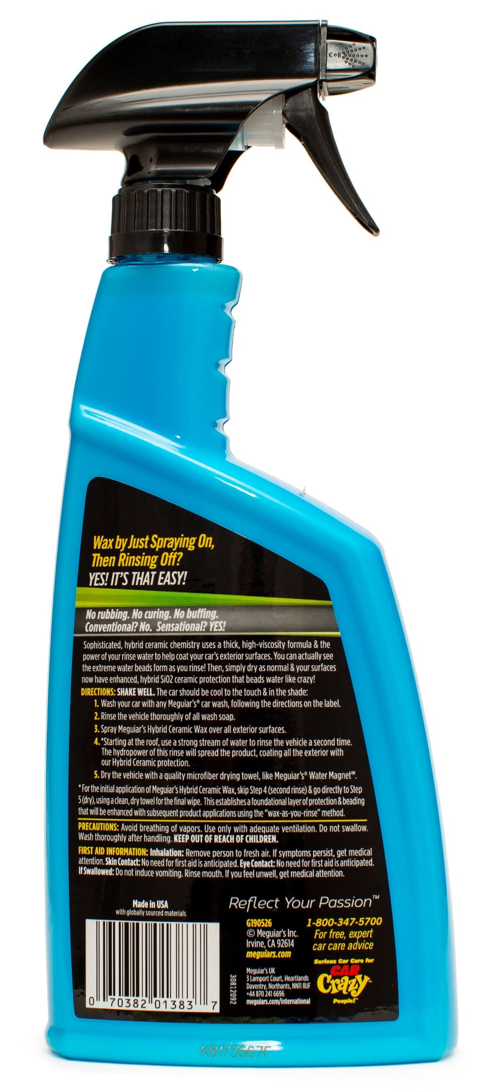 Wax as you rinse! Advanced SiO2 technology. Ceramic made easy! Protection & durability beyond conventional wax. Simply spray on, rinse off & dry! Wax by just spraying on, then rinsing off? Yes! It’s that easy! No rubbing. No curing. No buffing. Conventional? No. Sensational? Yes! Sophisticated, hybrid ceramic chemistry uses a thick, high-viscosity formula & the power of your rinse water to help coat your car's exterior surfaces. You can actually see the extreme water beads form as you rinse! Then, simply dry as normal & your surfaces now have enhanced, hybrid SiO2 ceramic protection that beads water like crazy! Reflect your passion. Serious car care for car crazy people! Meguiars.com. Meguiars.com/international. For free, expert car care advice 1-800-347-5700. Made in USA with globally sourced materials.