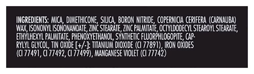 Ingredients: Mica, Dimethicone, Silica, Boron Nitride, Copernicia Cerifera (Carnauba) Wax, Isononyl Isononanoate, Zinc Stearate, Zinc Palmitate, Octyldodecyl Stearoyl Stearate, Ethylhexyl Palmitate, Phenoxyethanol, Synthetic Fluorphlogopite, Caprylyl Glycol, Tin Oxide [+/-]: Titanium Dioxide (CI 77891), Iron Oxides (CI 77491, CI 77492, CI 77499), Manganese Violet (CI 77742)