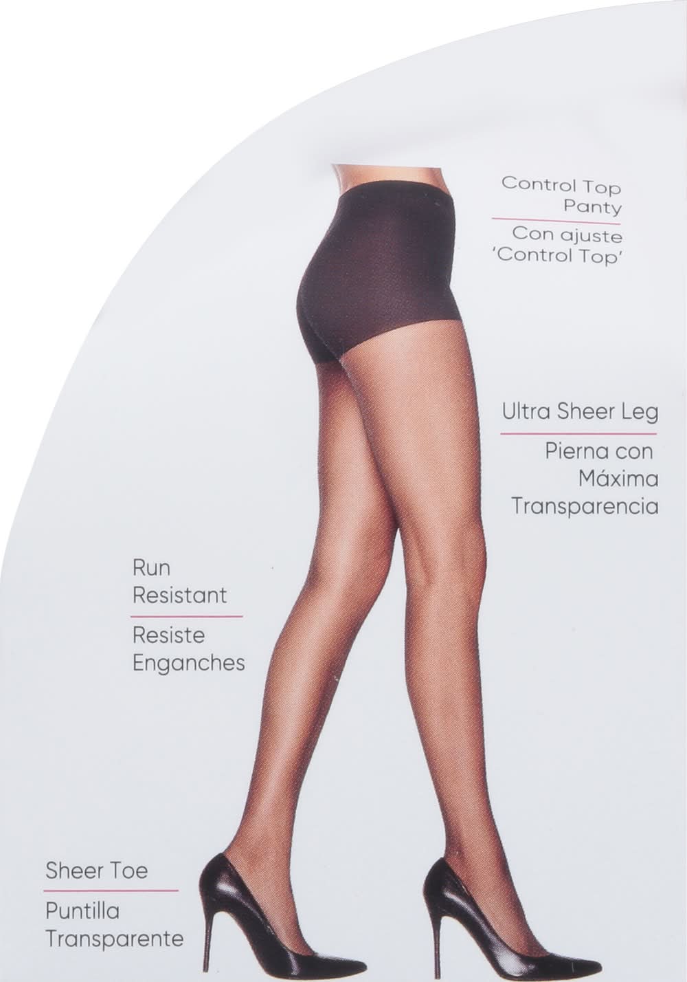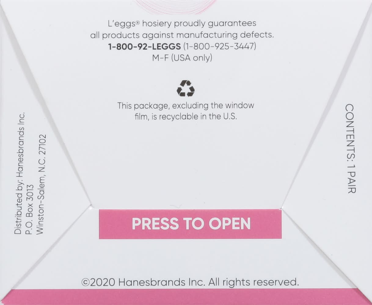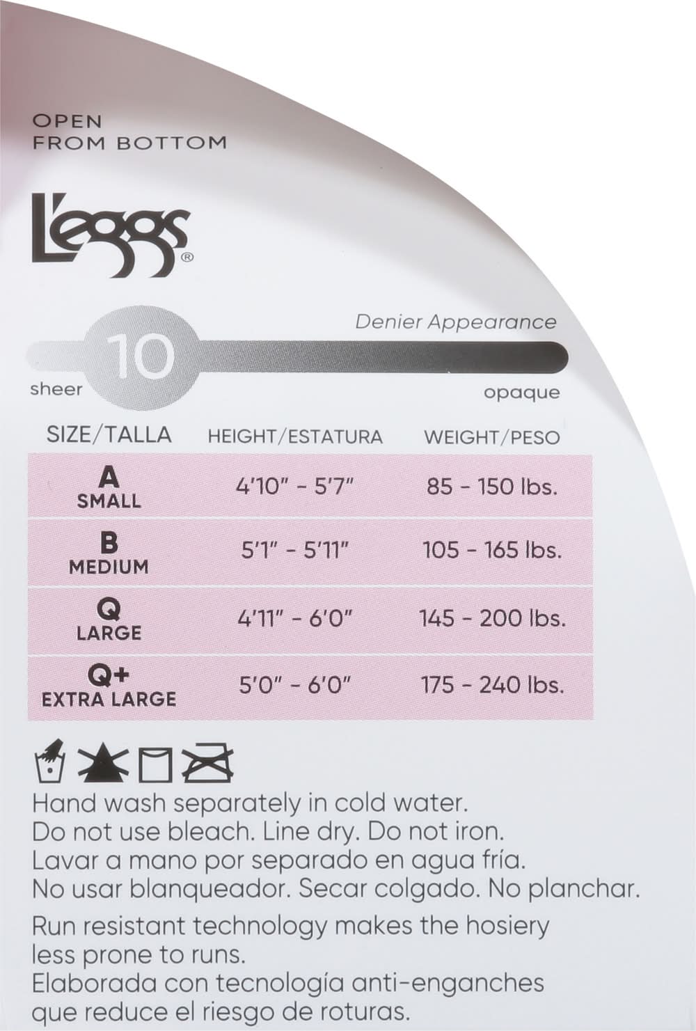 Contents: 1 pair. Control top. Run resistant technology. Ultra sheer leg provides maximum sharpness, made with run resistant technology. You're in Luck. You're in L'eggs. Size: Small (A); Height: 4 foot 10 inches - 5 foot 7 inches; Weight: 85 - 150 lbs. Size: Medium (B); Height: 5 foot 1 inch - 5 foot 11 inches; Weight: 105 - 165 lbs. Size: Large (Q); Height: 4 foot 11 inches - 6 foot 0 inches; Weight: 145 - 200 lbs. Size: Extra Large (Q+); Height: 5 foot 0 inches - 6 foot 0 inches; Weight: 175 - 240 lbs. Run resistant technology makes the hosiery less prone to runs. Control top panty. Ultra sheer leg. Run resistant. Sheer toe. L'eggs hosiery proudly guarantees all products against manufacturing defects. 1-800-92-LEGGS (1-800-925-3447) M-F (USA only). www.leggs.com. This package, excluding the window film, is recyclable in the U.S. Made in El Salvador. Packaging: Reusable