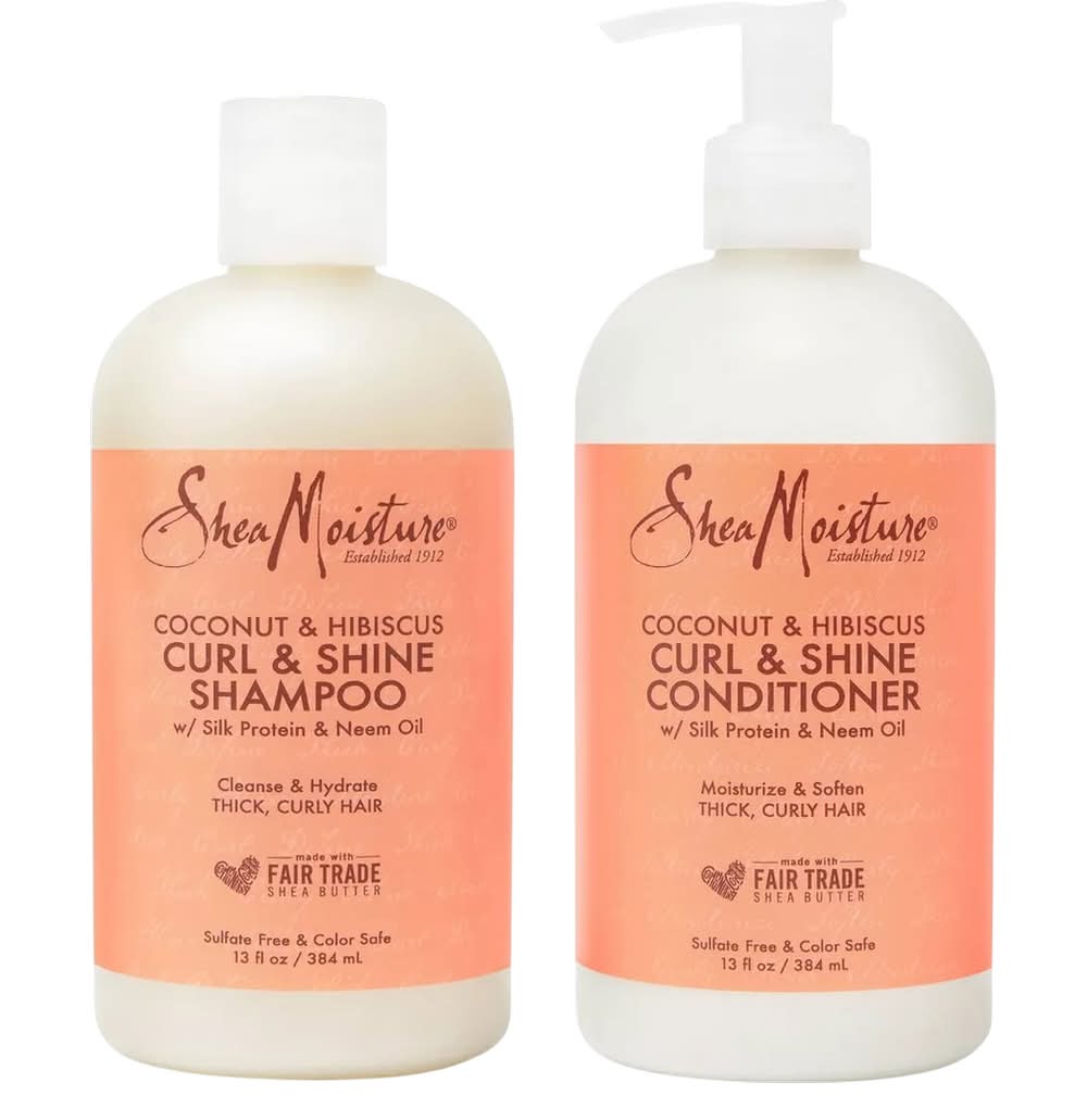 Transform dry, brittle hair into bouncy, vibrant waves and curls. SheaMoisture Curl and Shine Shampoo is a phthalate-free, paraben-free, and cruelty-free hair product that gently cleanses, improves hair's health, and restores shine. This shampoo, blended with neem oil, improves hair elasticity while reducing the occurrence of breakage. It moisturizes and leaves curls with a stunning shine. When used with conditioner, get 24 hour frizz & humidity control. Give your hair a smooth and shiny finish by conditioning your hair with SheaMoisture’s Coconut & Hibiscus Curl and Shine Silicone-Free Conditioner for curly hair. This Curl & Shine Conditioner pumps up the hydration and leaves you with more moisturized curls after just one use. Get gorgeous shine, irresistible softness, and beautifully defined natural curls. How to use: After shampooing with SheaMoisture Shine & Curl Shampoo, apply the Coconut & Hibiscus Conditioner generously and use a comb to evenly distribute the conditioner for hair. Leave it in for 3 minutes, rinse, and style as desired. Our Story: SheaMoisture is the legacy of Sofi Tucker, a pioneering mother of four and an entrepreneur, who sold Shea Butter, African Black Soap and homemade beauty preparations in Sierra Leone in 1912. We honor her vision by continuing to formulate with Raw Shea Butter handcrafted by women in Africa. With every purchase, you show support of our mission to reinvest back in our communities. Pack size: 2