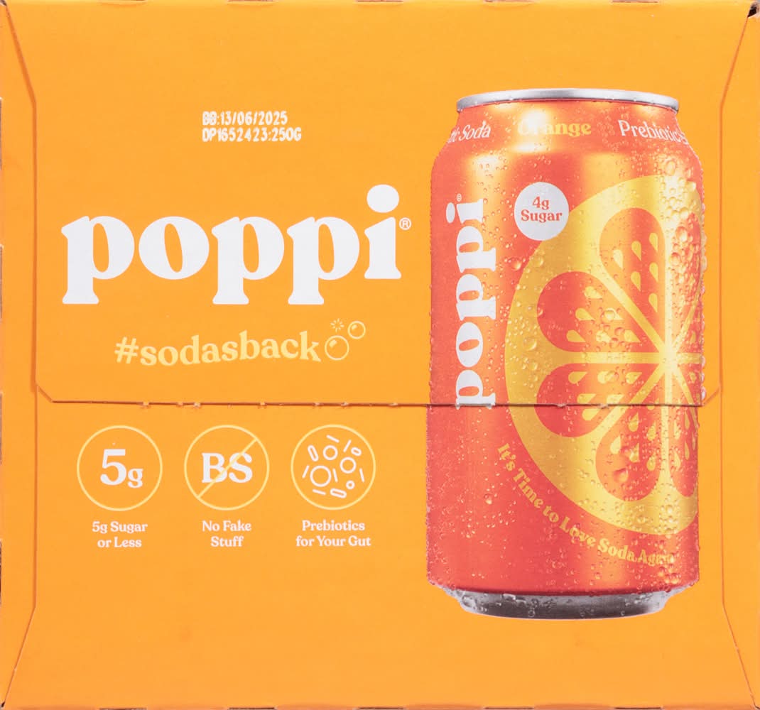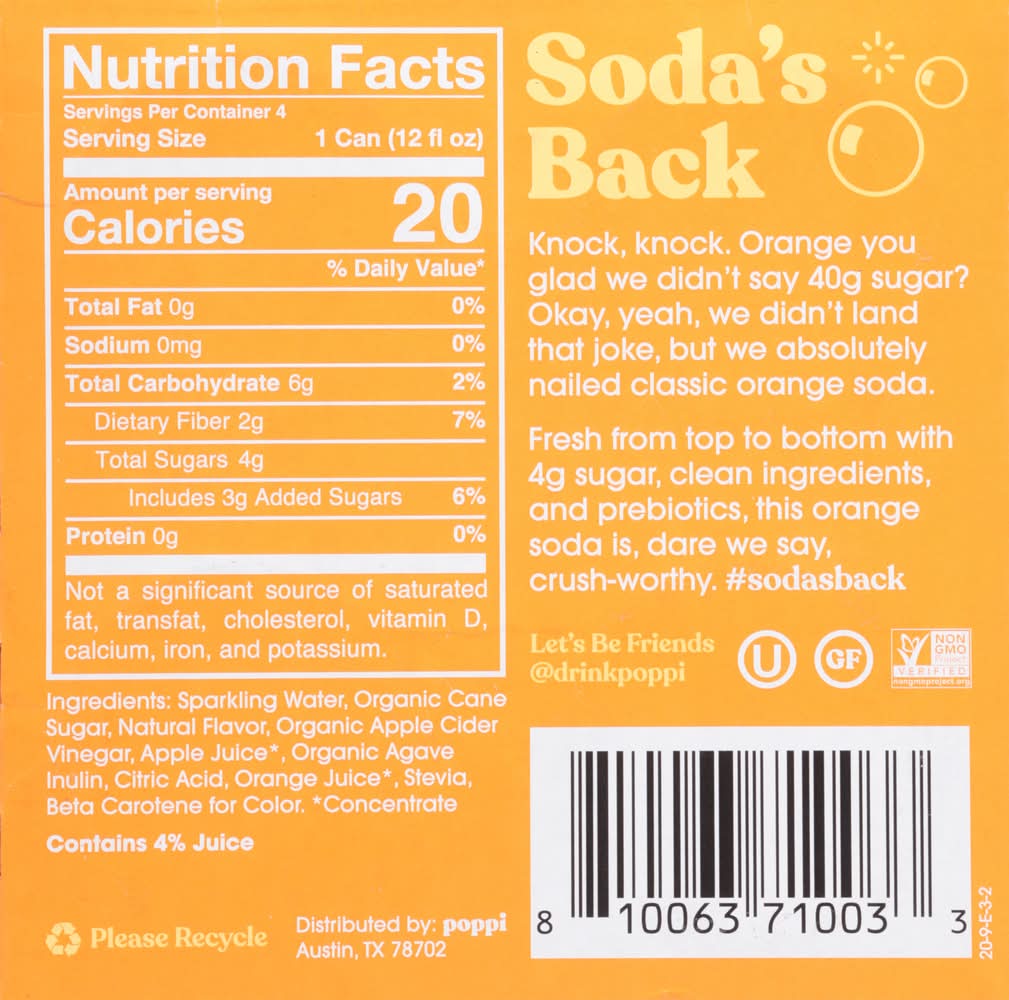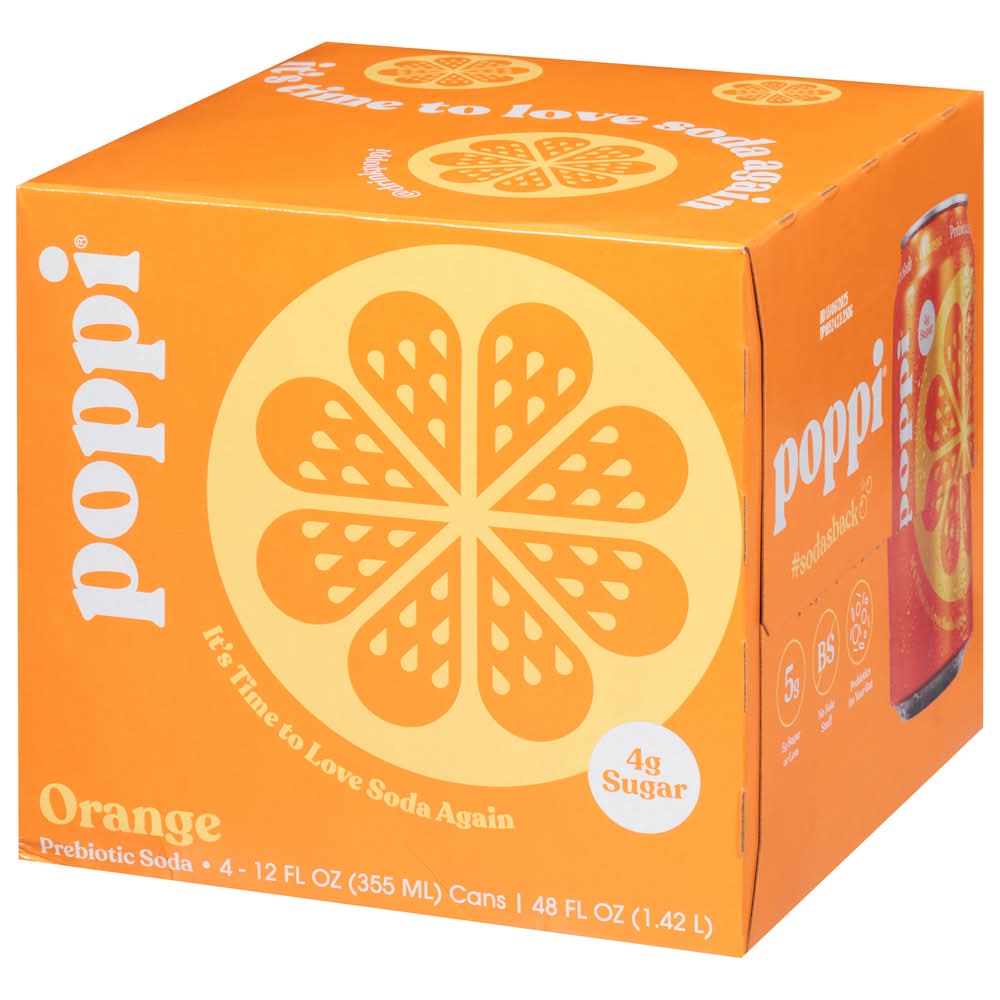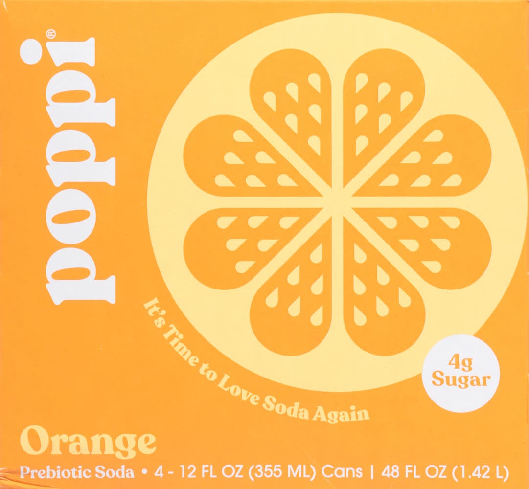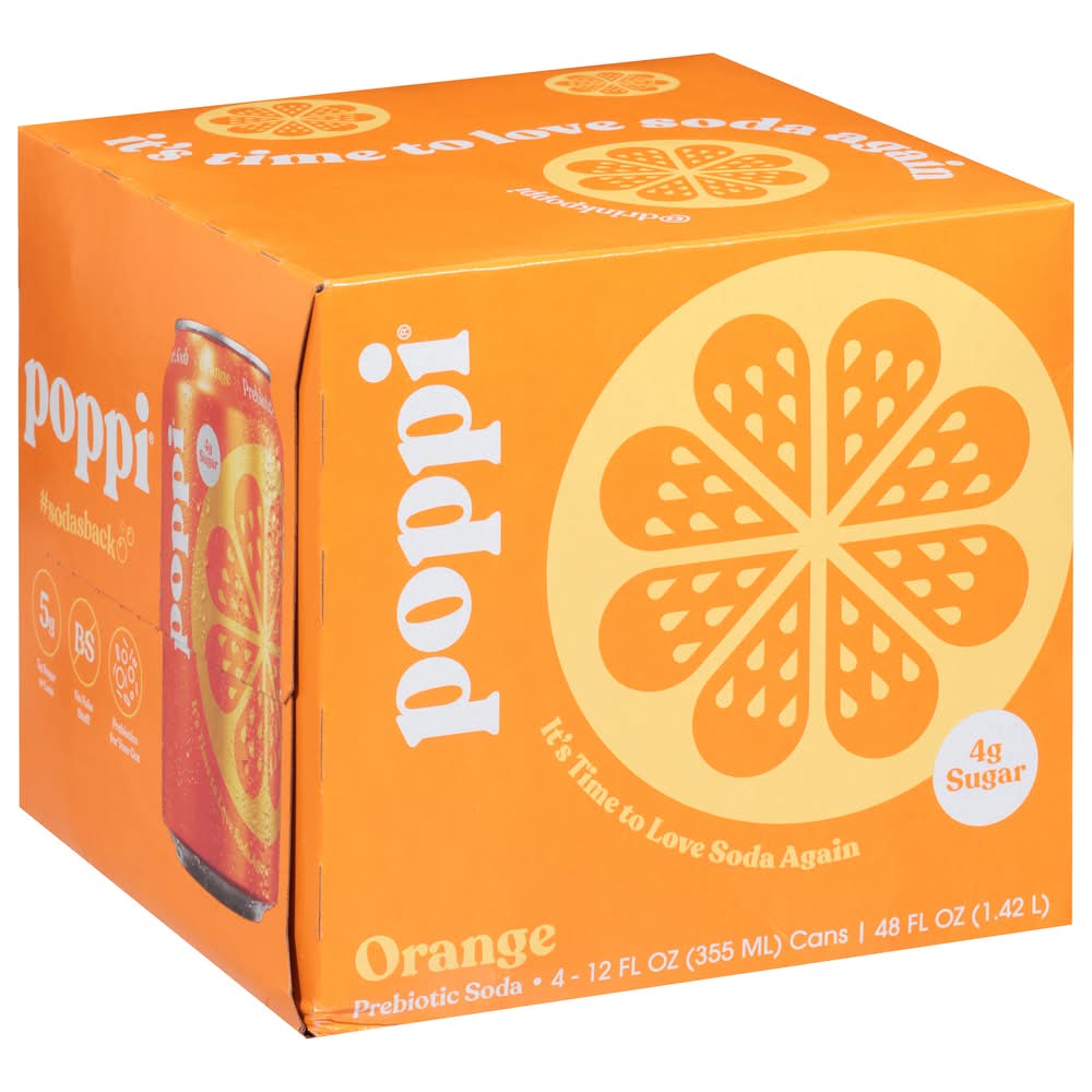 Poppi is a healthy sparkling prebiotic soda with real fruit juice, gut health & immunity benefits. Prebiotics for your gut health, 30 calories or less, 4 grams of sugar or less Infused with Apple Cider Vinegar Non-GMO, Gluten Free, Kosher Certified, No Fake Stuff. Four pack • Flavor: Orange • Pack size: 4 • Packaging: Reusable
