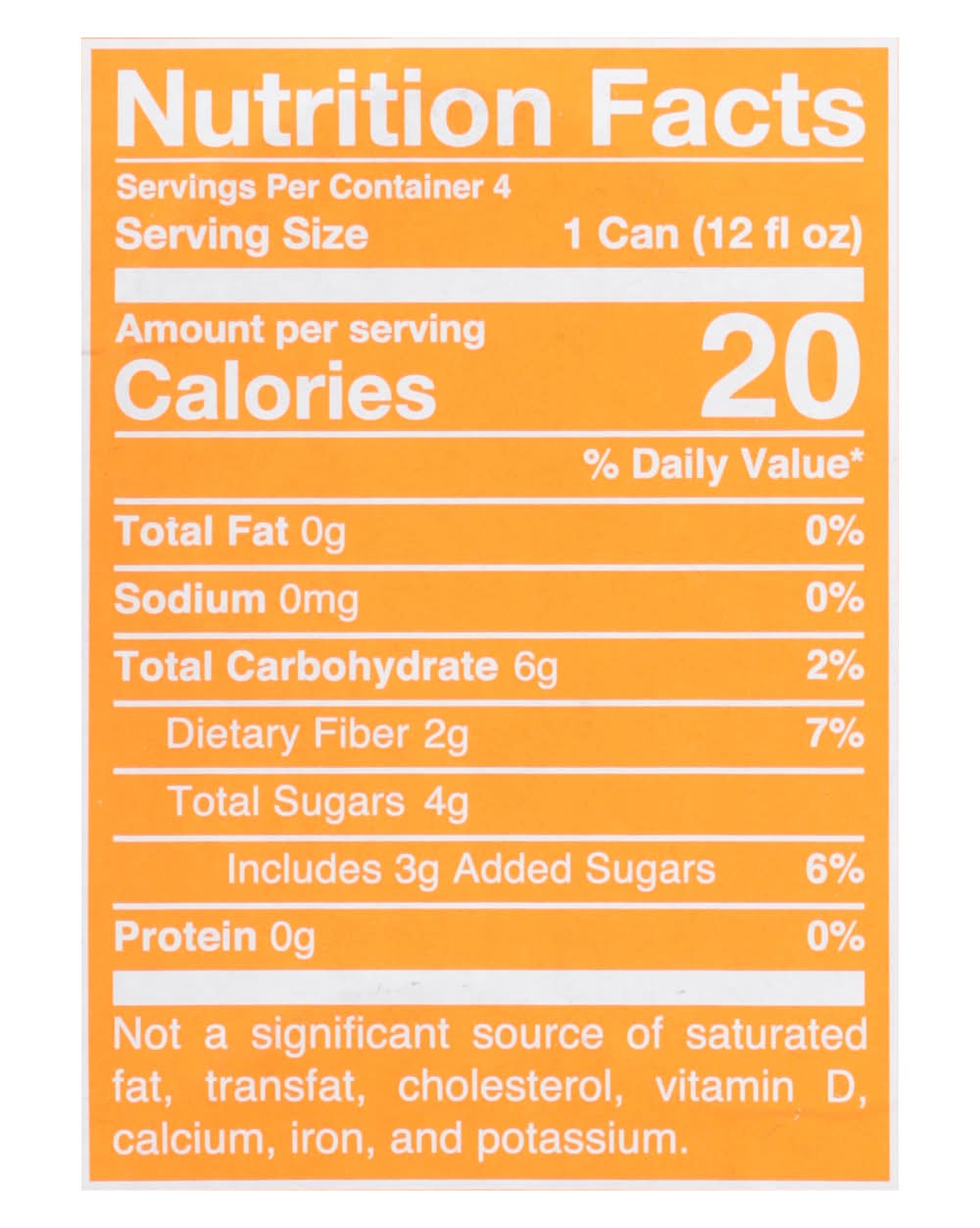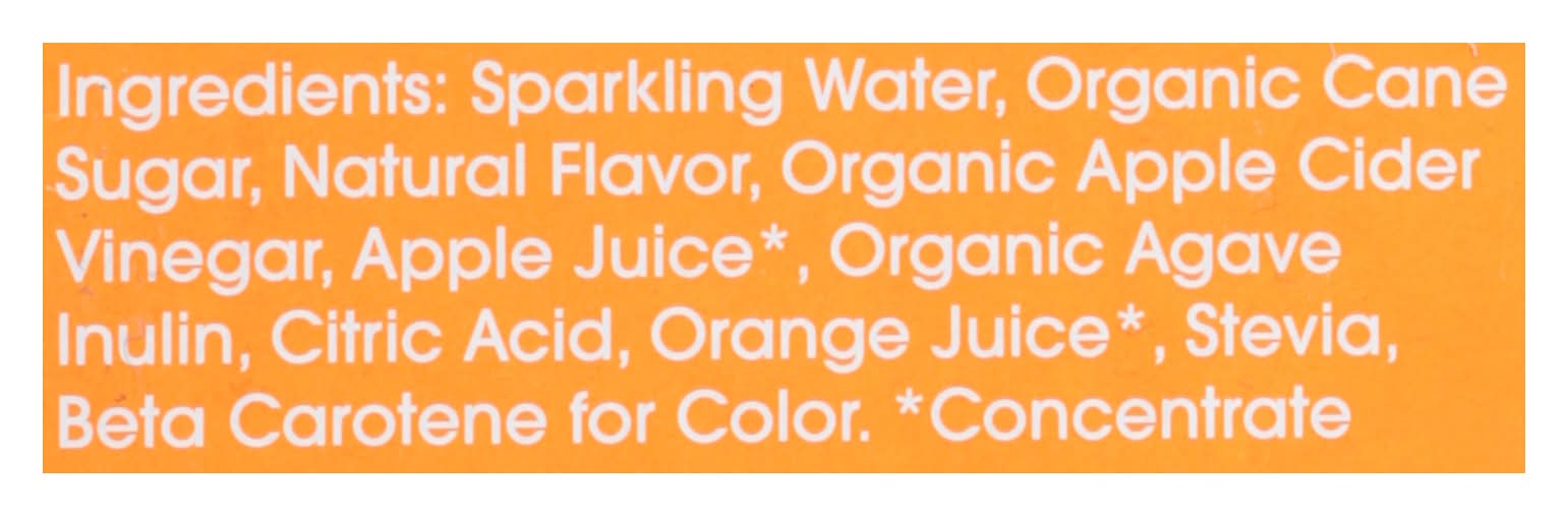Ingredients: Sparkling Water, Organic Cane Sugar, Natural Flavor, Organic Apple Cider Vinegar, Apple Juice*, Organic Agave Inulin, Citric Acid, Orange Juice*, Stevia, Beta Carotene for Color. *Concentrate Contains: Gluten