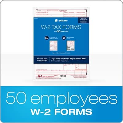 Have the right form on hand for 2020 with this Adams laser W2 tax forms pack. Get the forms you need to report wages for up to 50 employees. Adams Tax value pack includes 50 6-part W-2 forms and three W-3 summary reports. - Use Form W-2 to report employee wages, tips and taxes withheld to the Social Security Administration and your employees - 2020 W-2 forms must be mailed or e-filed to the SSA and furnished to your employees by February 1, 2021 - 6-Part W-2 forms print 2 to a page on 25 micro perforated sheets with copies A, D/1, B, C, 2 and D/1 - All Adams laser tax forms are inkjet and laser printer compatible - Pack contains 50 W-2 forms and three W-3 summary forms - Sheet Size: 8-1/2 x 11 Detached Size: 5-1/2 x 8-1/2 - White forms have scannable red ink Copy A and W-3 required by the IRS for paper filing - Acid-free paper and heat-resistant inks produce smudge-free, archival-safe records - Meets or exceeds IRS specifications - Accounting software and QuickBooks compatible strongPrepare your tax forms faster! br/br/Try Adams Tax Forms Helper Online 2020*/strongbr/ Generate your 2020 tax forms with minimal data entry and anxiety. Adams Tax Forms Helper Online makes filing simple, affordable and painless. For online tax preparation of the 2020 1099-MISC, 2020 1099-NEC, W-2, 1096, W3, 1099-INT, 1099-R, 1099-DIV, 1098 and ACA forms.br/br/strongE-file or print and mail—we're flexible./strongbr/Adams Tax keeps your filing options open. High-quality Adams tax forms work seamlessly with Adams Tax Forms Helper Online—an authorized IRS e-file provider.br/br/strongChoose faster, safer filing./strongbr/When e-filing, Adams Tax uses 256-bit AES encryption for military-grade classified data storage. Your tax data is transmitted to federal agencies with secure TLS protocols to ensure end-to-end authentication, privacy and data integrity that's both faster and safer than snail mail.br/br/strongUse quick & easy imports./strongbr/Pull tax data from the previous tax year or import from a CSV file. Even if you didn't use Adams Tax last year, you can stop rekeying and start enjoying life.br/br/br/br/Error-proof your work. Tax Forms Helper creates your 1096 and W-3 summary forms, no math anxiety required. Gives you error-free summary reports to minimize costly IRS penalties.br/br/strongFor CPAs, accountants, households and small businesses./strongbr/Whether you report income for a nanny or 1,000 employees, you can prepare professional W-2s and 1099s.br/br/strongGo full service and relax./strongbr/With Print and Mail service, you can cut your workload in half! E-file and let us mail your employees/recipients so you don't have to. Additional fees apply.br/br/strong*Not included in this pack./strongbr/