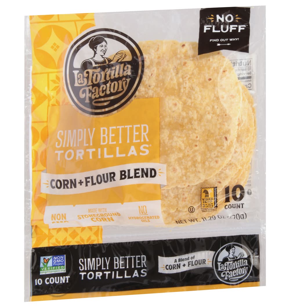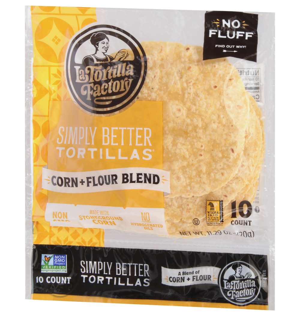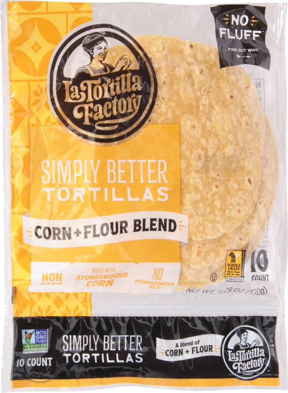 A blend of corn + flour. Whole Grain: 9 g or more per serving. Eat 48 g or more of the whole grains daily. WholeGrainCouncil.org. Non-GMO Project verified. nongmoproject.org. Non-GMO ingredients. No fluff. No hydrogenated oils. Simply better tortillas. Traditional texture simple ingredients. Uncompromising taste. This is our pledge when making Simply Better Tortillas. We do not use any extra or unnecessary ingredients. While other brands rely on ingredients like hydrogenated oils, artificial sweeteners and mono and diglycerides to bulk up their tortillas, you won’t find any of that here! Always Non-GMO and made with stoneground corn, our Simply Better Tortillas are authentic without all the stuff. No mono and diglycerides. No hydrogenated oils. No artificial sweeteners. Food, family and well-being are at the heart of everything we do. - Jenny Tamayo, Third Generation Family Member. WholeGrainCouncil.org. latortillafactory.com. Facebook. Pinterest. Instagram. For tips and recipes visit: latortillafactory.com. 3300 Westwind Blvd, Santa Rosa, CA 95403. 800-446-1516. La Tortilla Factory,