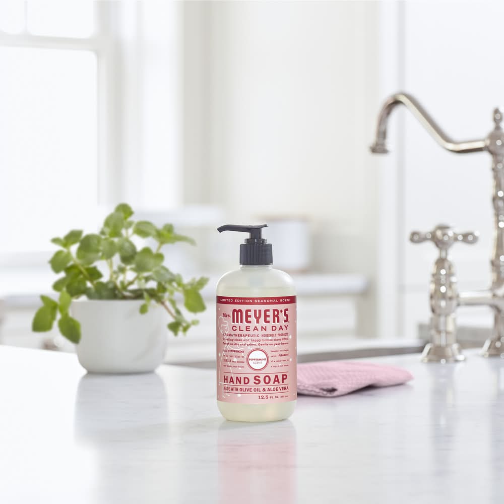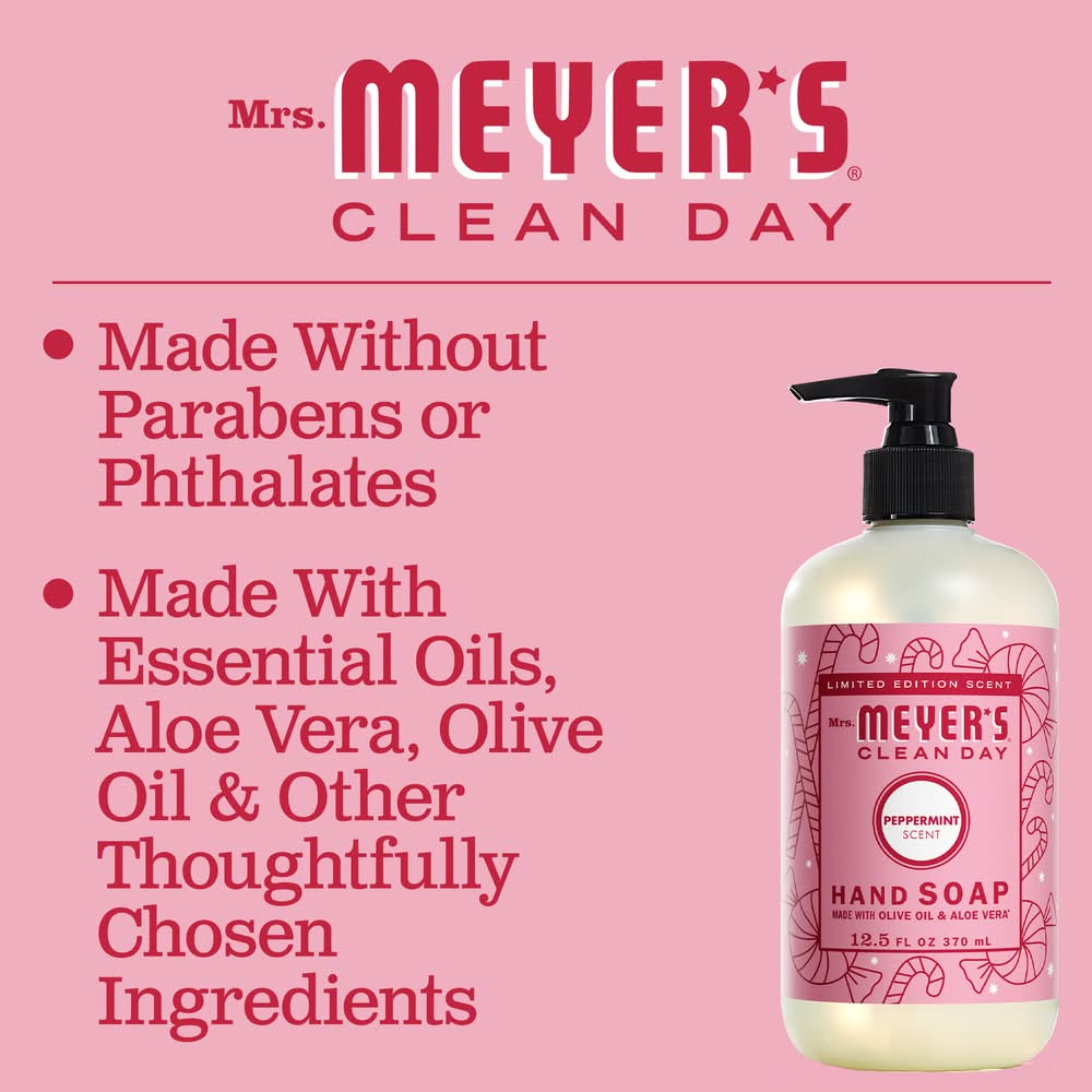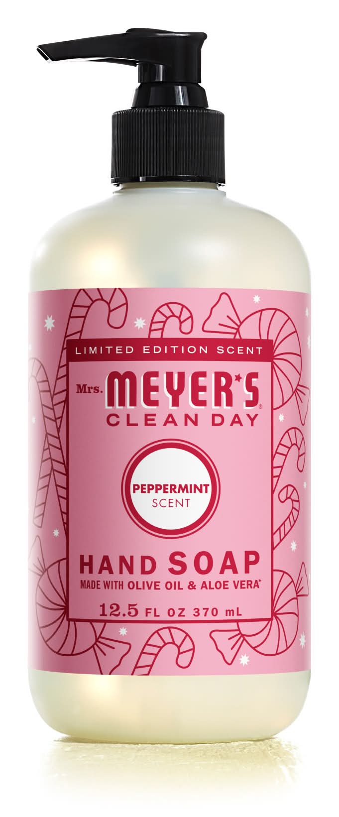 Mrs. Meyer's Peppermint Hand Soap is a limited edition product containing 12.5 fluid ounces of hand soap formulated with plant-derived cleaning ingredients, essential oils, aloe vera extract, glycerin, and olive oil. The contents of this hand soap are biodegradable, and it is made without parabens, phthalates, MEA, DEA, and artificial colors. Designed to be cruelty-free, the bottle, excluding the pump, is made with at least 30% post-consumer plastic.