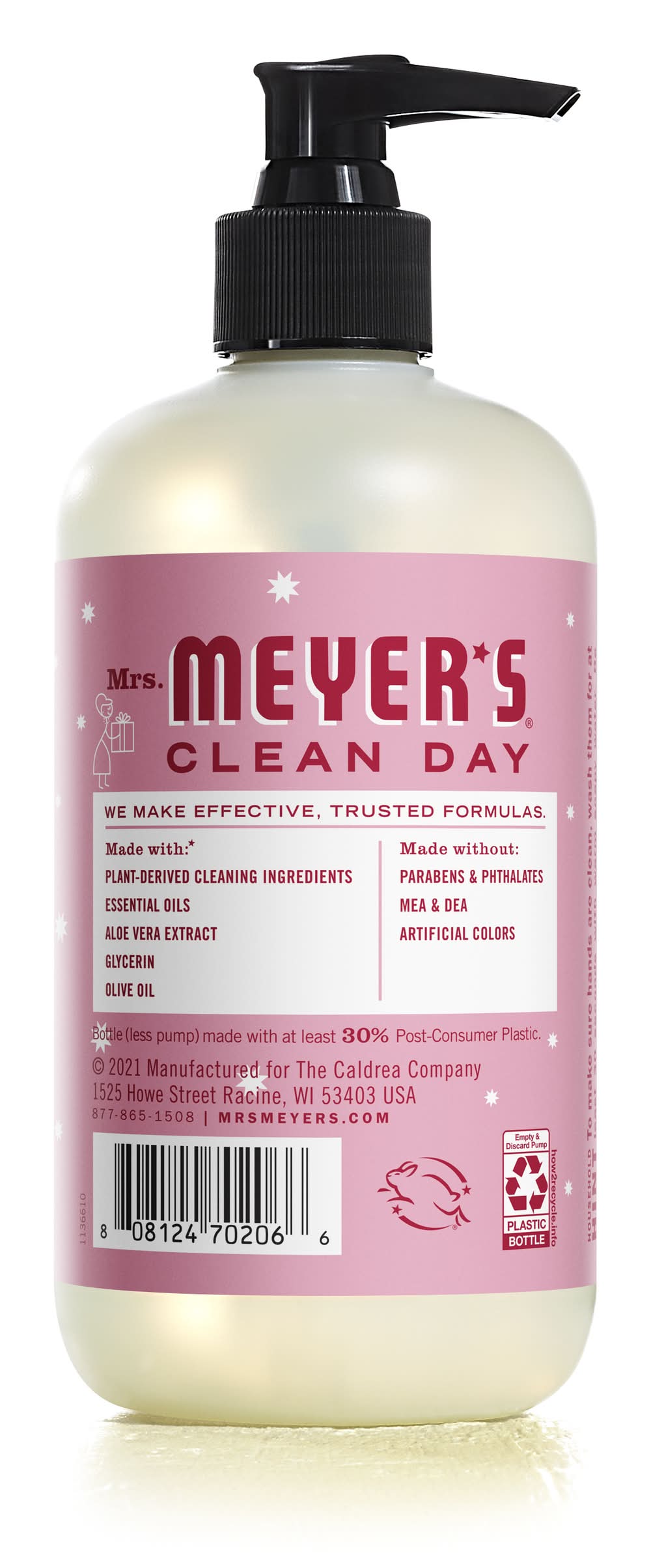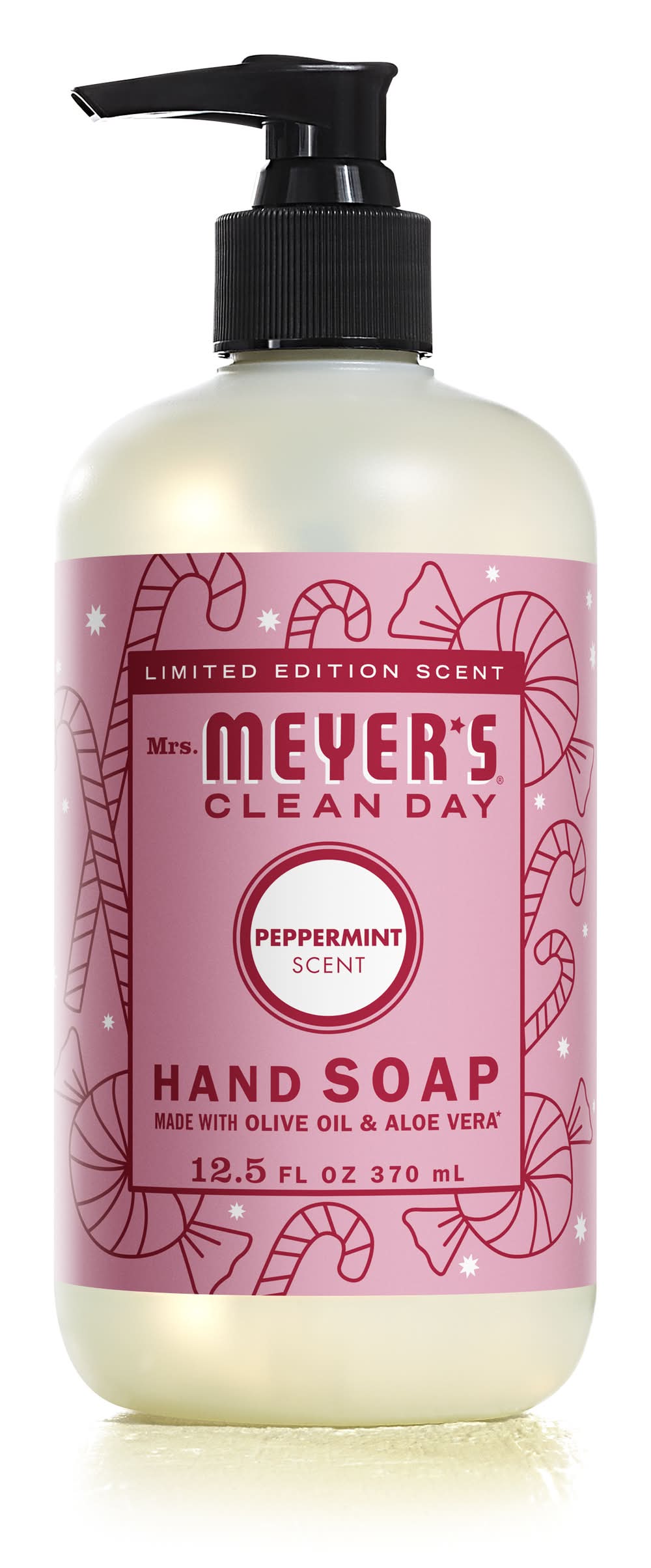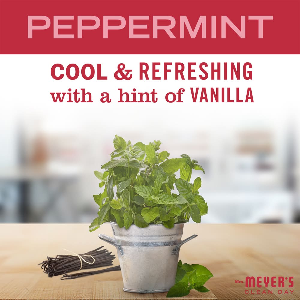 Mrs. Meyer's Peppermint Hand Soap is a limited edition product containing 12.5 fluid ounces of hand soap formulated with plant-derived cleaning ingredients, essential oils, aloe vera extract, glycerin, and olive oil. The contents of this hand soap are biodegradable, and it is made without parabens, phthalates, MEA, DEA, and artificial colors. Designed to be cruelty-free, the bottle, excluding the pump, is made with at least 30% post-consumer plastic.