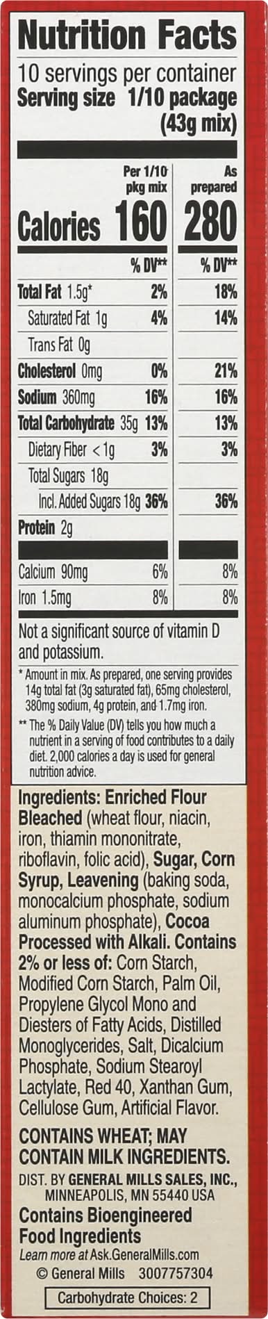 Per 1/10 Package: 160 calories; 1 g sat fat (4% DV); 360 mg sodium (16% DV); 18 g total sugars. See nutrition facts for as prepared information. Contains bioengineered food ingredients. Learn more at Ask.GeneralMills.com. There's pudding in the mix! Thank you for welcoming us into your home. We hope what's inside this box helps you bring more love to your table. Cordially Yours, Betty Crocker. The Red Spoon Promise: The Red Spoon is my promise of great taste, quality and convenience. This is a product you and your family will enjoy. I guarantee it. www.BettyCrocker.com. how2recycle.info. Make any day special with recipes and inspiration from BettyCrocker.com! Caramel Pretzel Cupcakes. Certified 100% recycled paperboard. Carbohydrate Choices: 2.